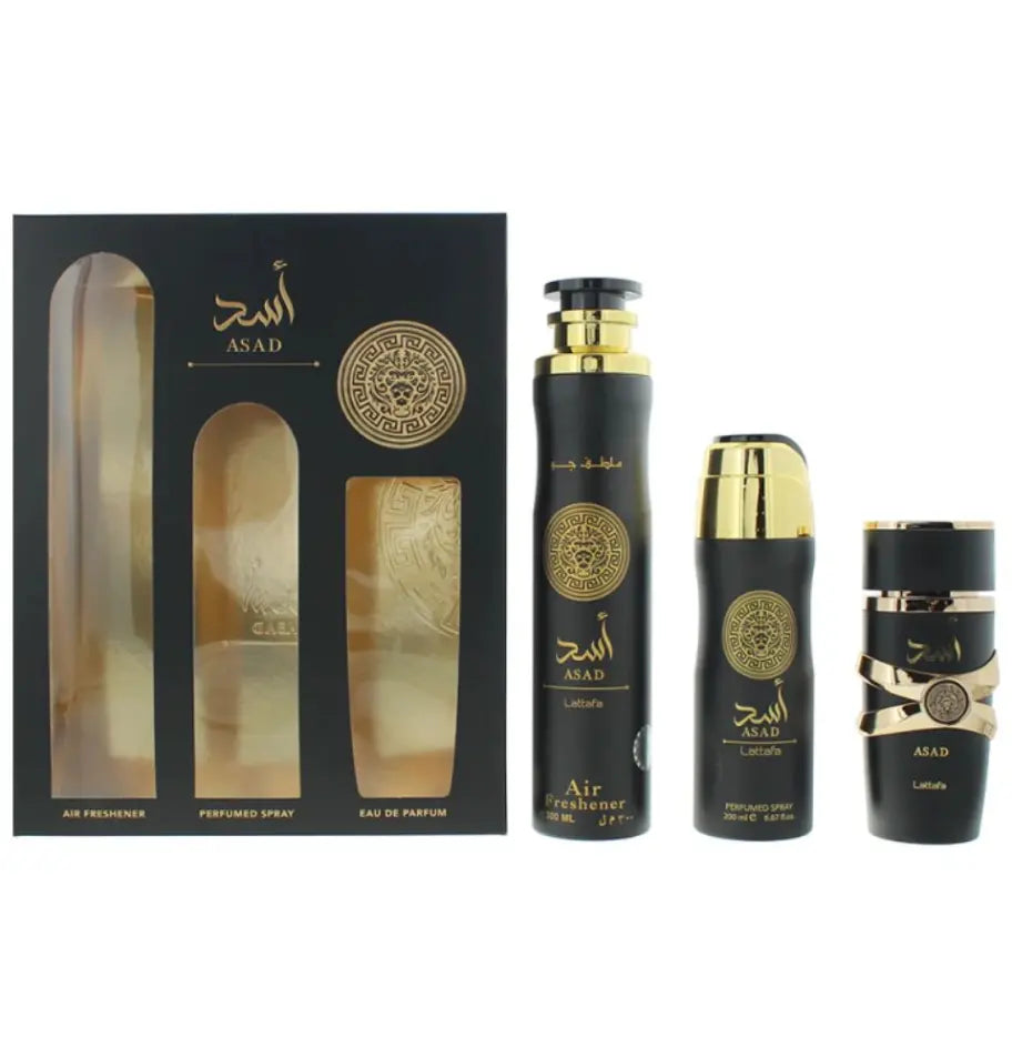 Подаръчен комплект Lattafa Asad - парфюм 100 мл, дезодорант 200 мл, ароматизатор 300 мл.