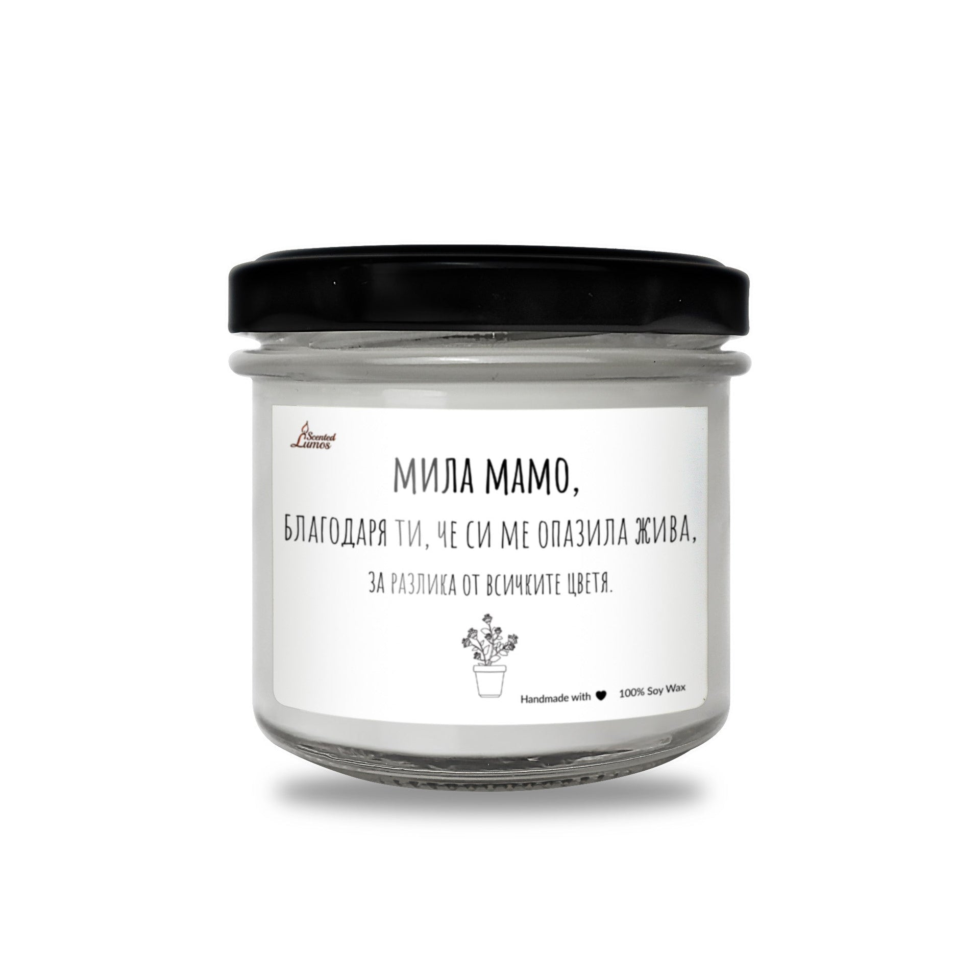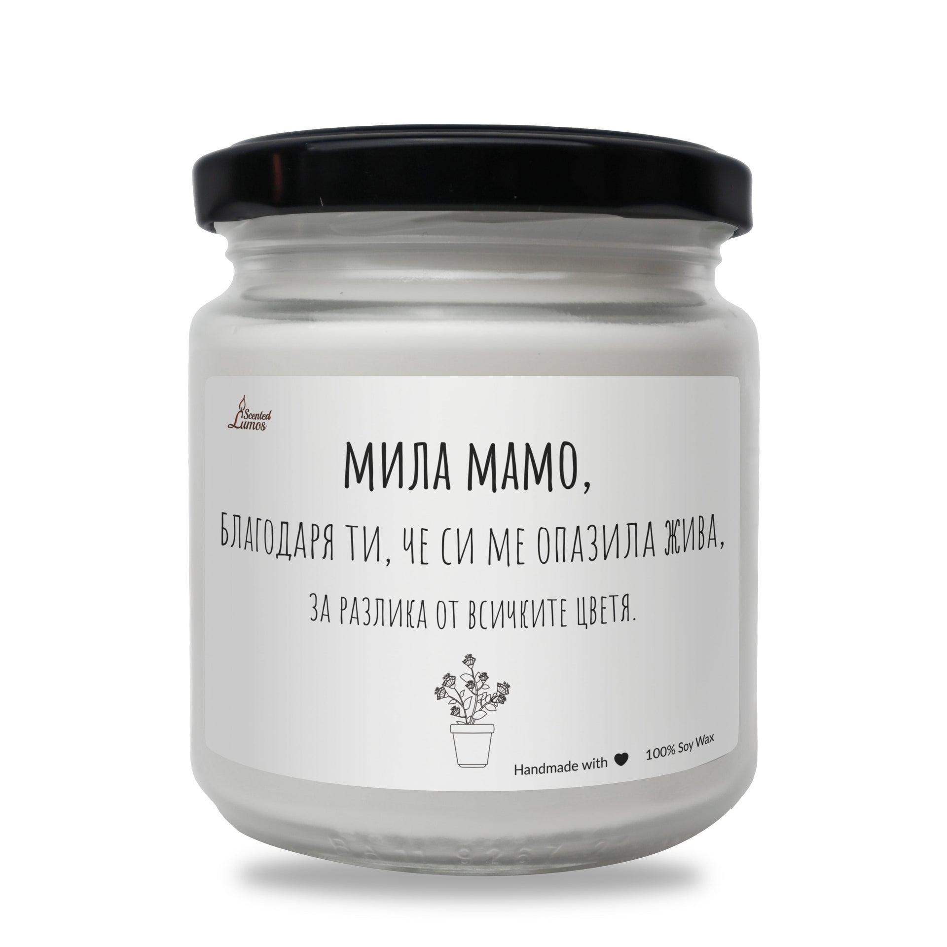 Оригинален подарък за майка с уникален дизайн: Благодаря ти, че си ме опазила жива Ароматна Соева Свещ - Подарете с любов за 8-ми март, Рожден Ден, Имен Ден, годишнина или друг специален повод