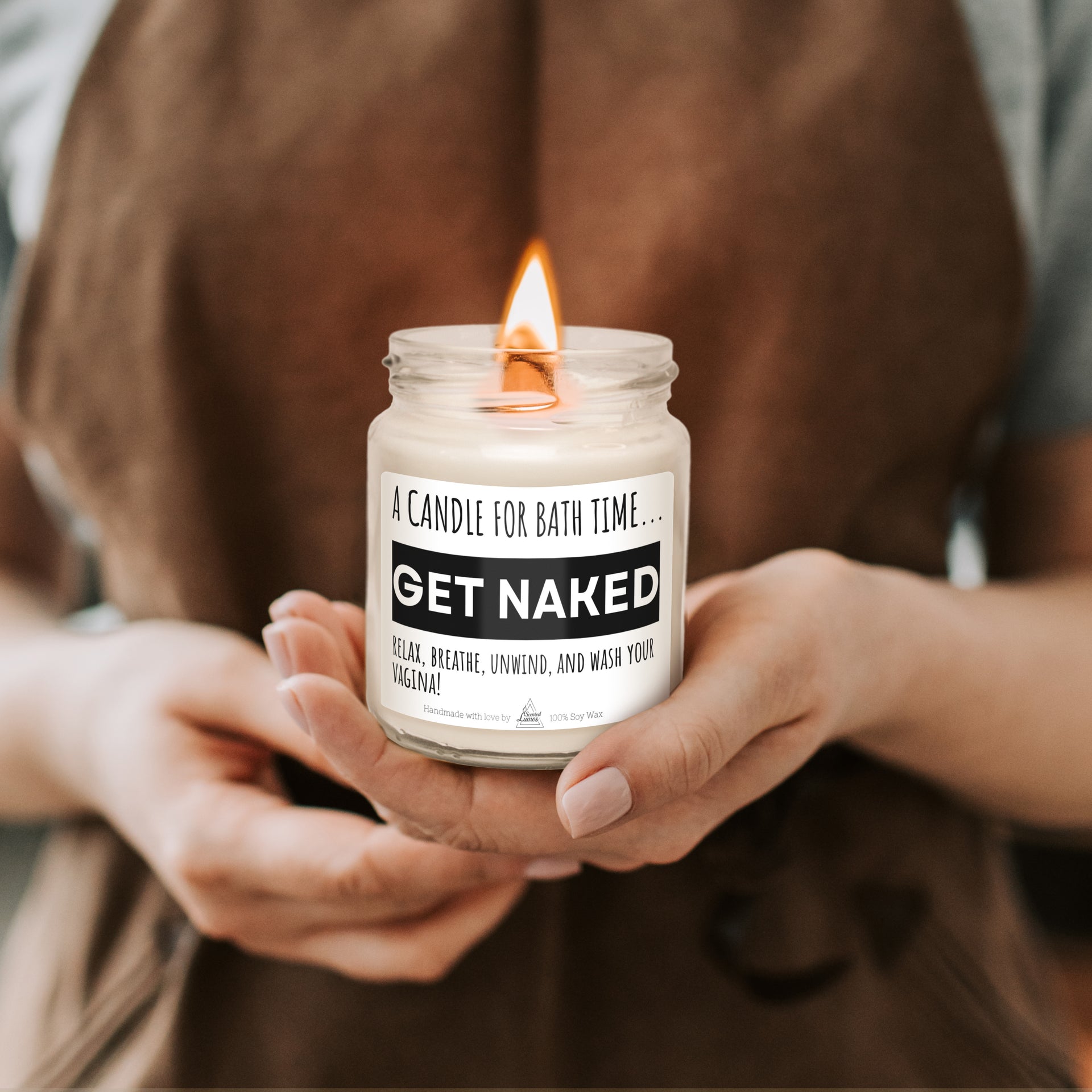 Оригинален и закачлив подарък за любим човек с интересен дизайн на английски език: Candle for bath time. Get Naked.