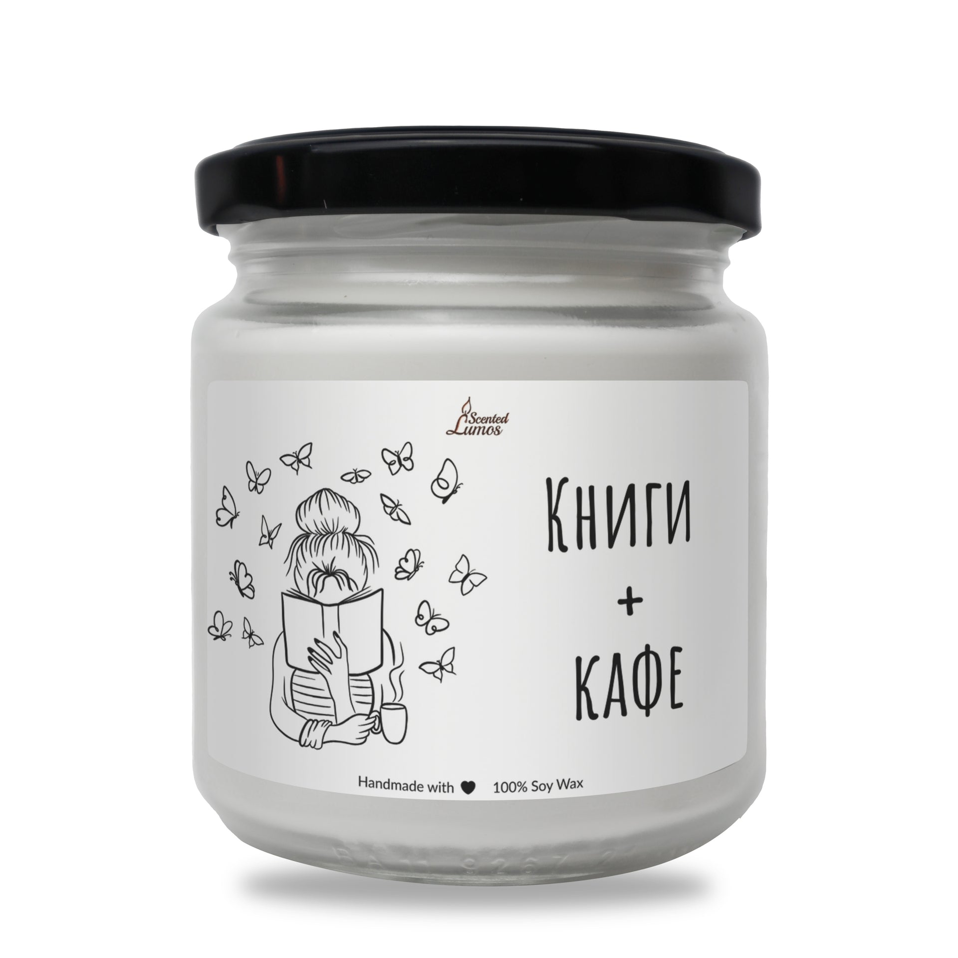 Оригинален подарък за обичащите книгите и кафето с уникален дизайн: Книги + кафе Ароматна Соева Свещ - Подарете с любов за 8-ми март, Рожден Ден, Имен Ден, годишнина или друг специален повод.