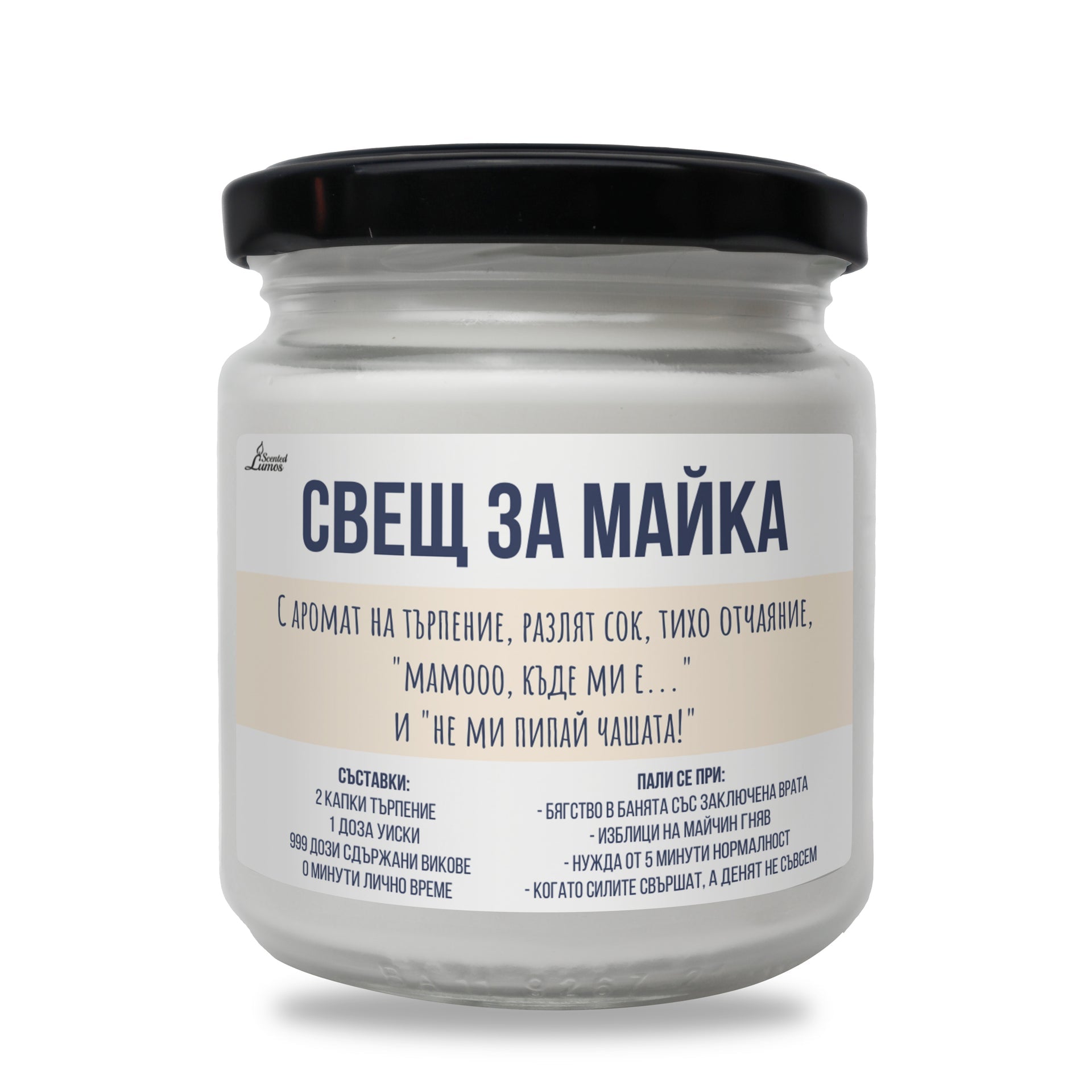 Оригинален и забавен подарък за майка с интересен дизайн: Свещ за майка - С аромат на търпение, разлят сок, тихо отчаяние, "мамооо, къде ми е..." и "не ми пипай чашата!".