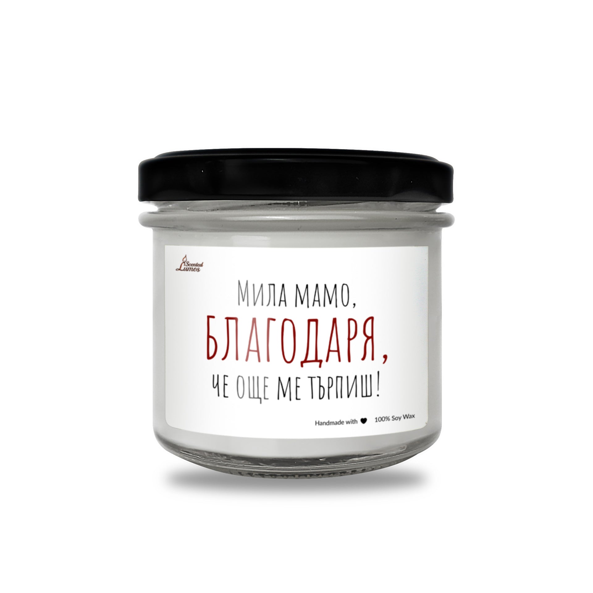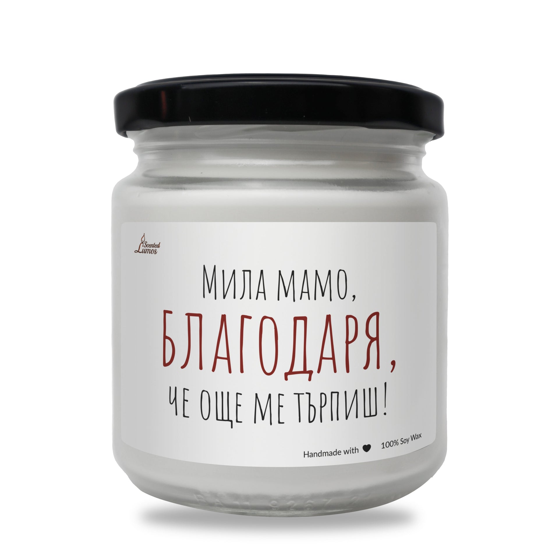 Оригинален подарък за майка с уникален дизайн: Мила мамо, благодаря че още ме търпиш! Ароматна Соева Свещ - Подарете с любов за 8-ми март, Рожден Ден, Имен Ден, годишнина или друг специален повод