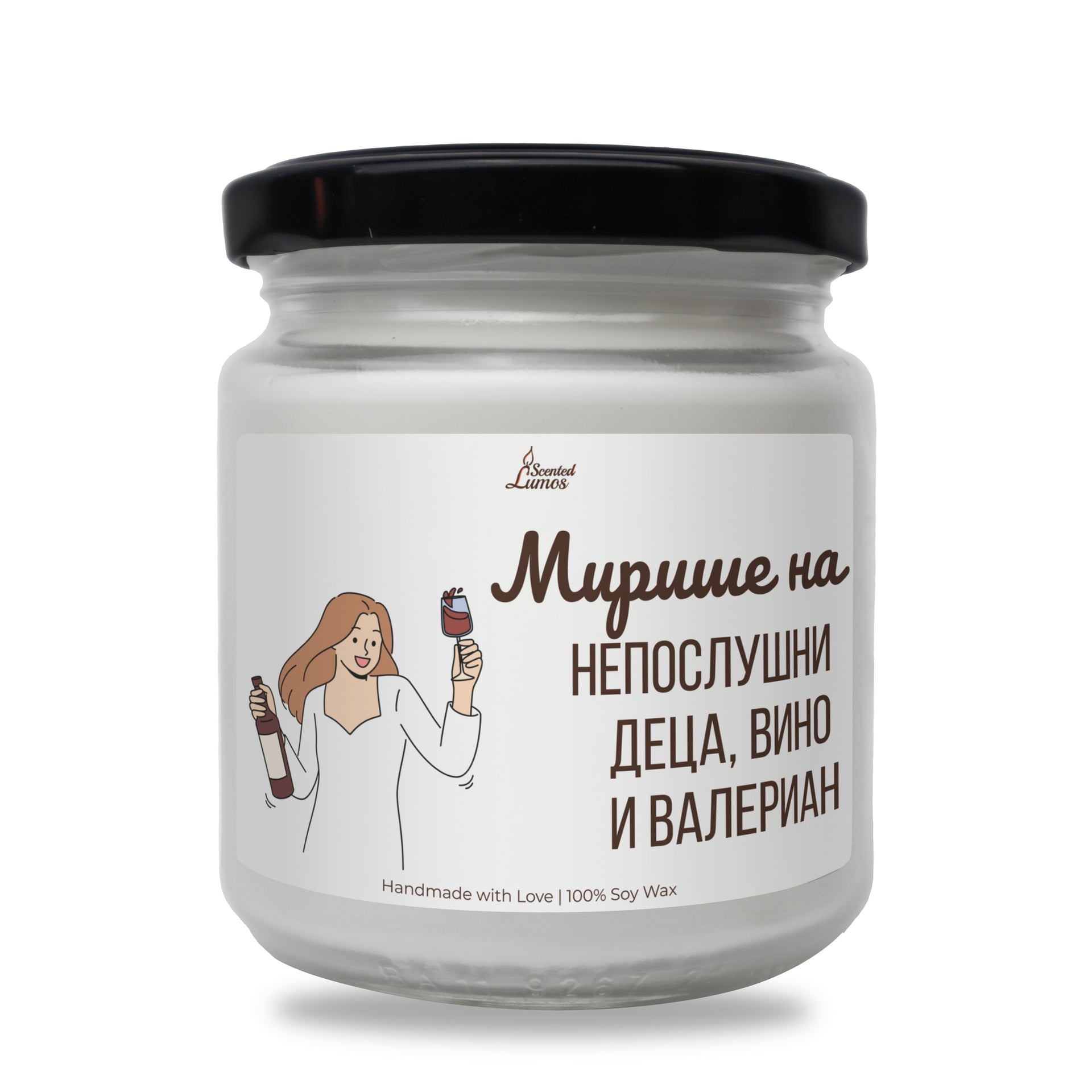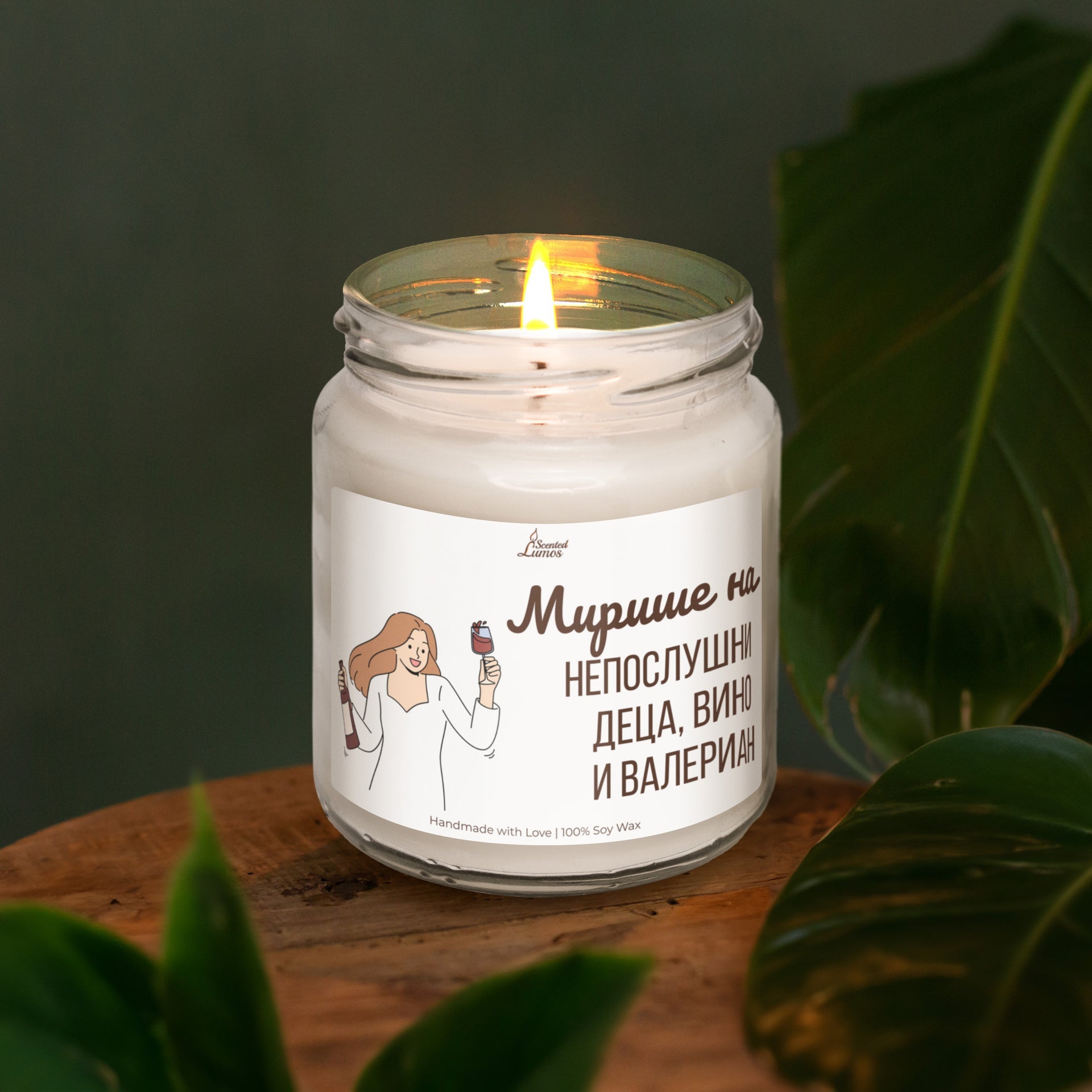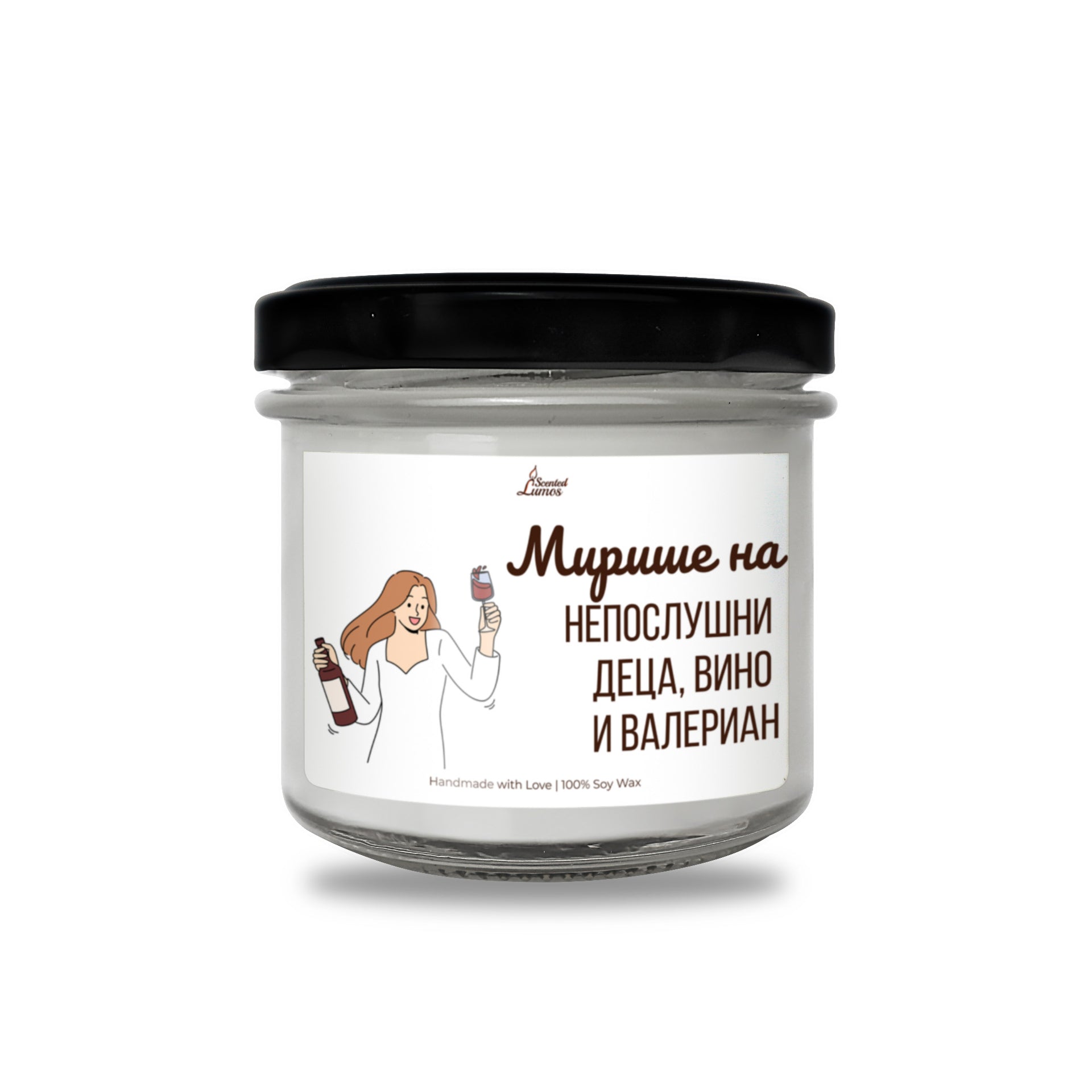 Мирише на непослушни деца, вино и валериан Ароматна Соева Свещ