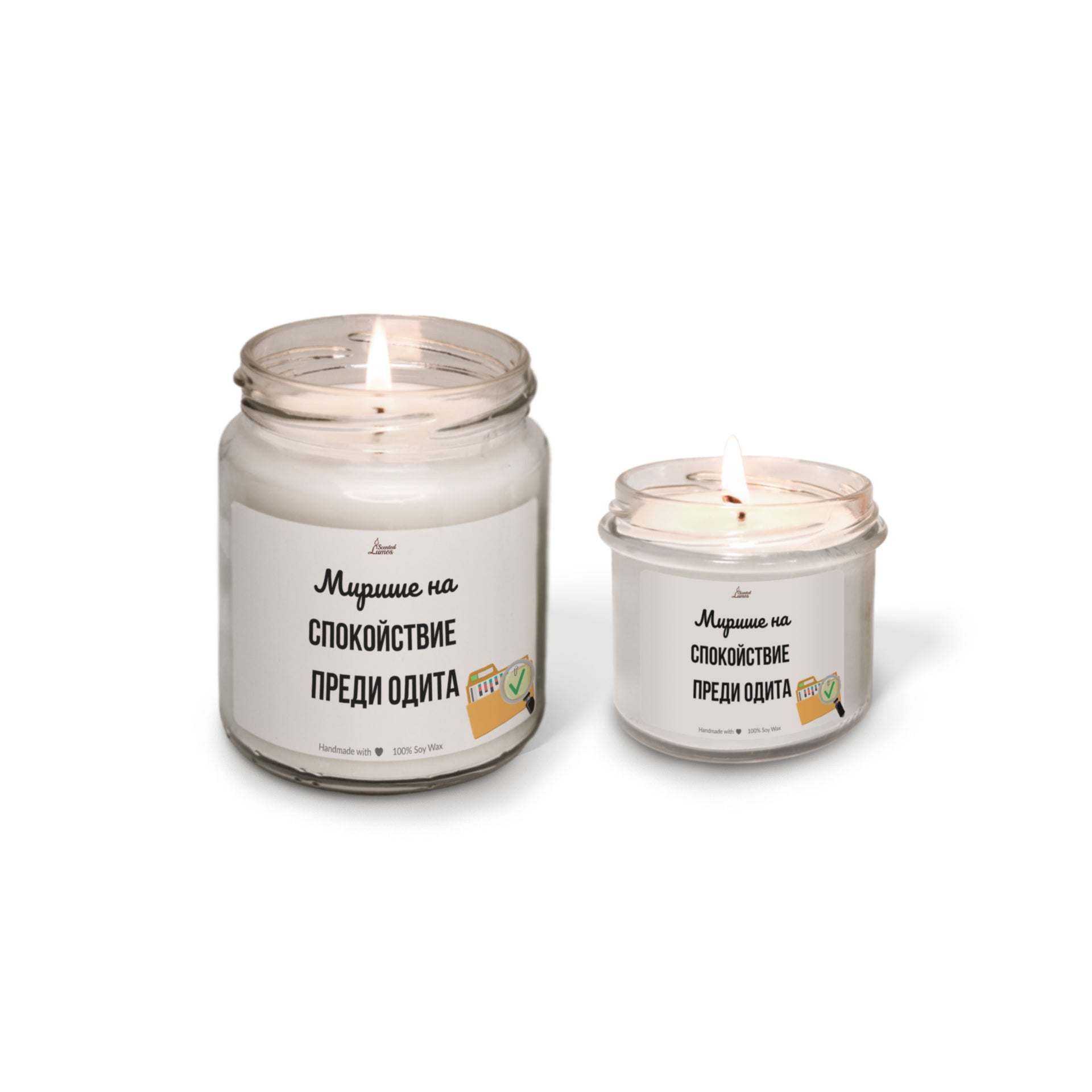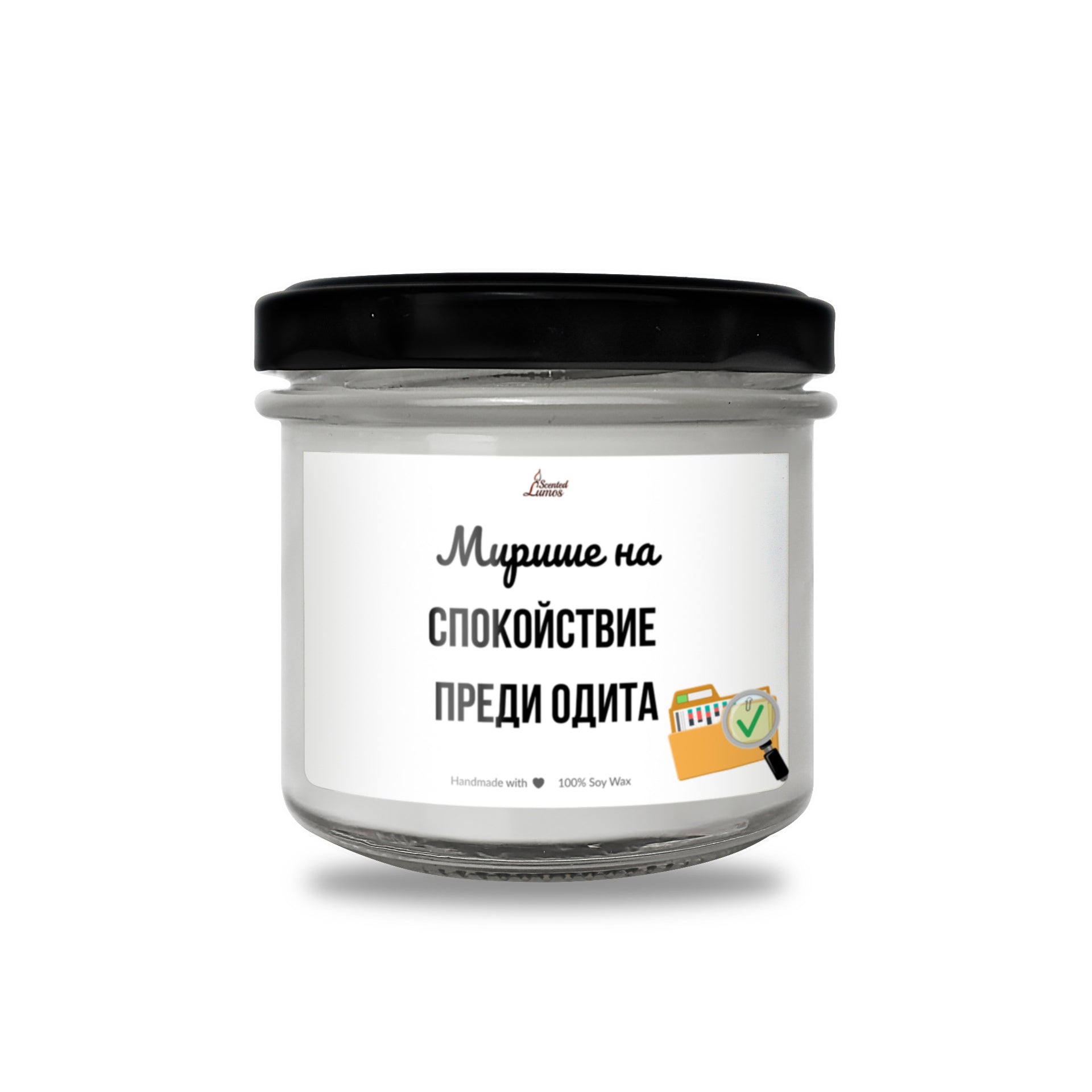 Мирише на спокойствие преди одита Ароматна соева свещ за счетоводител