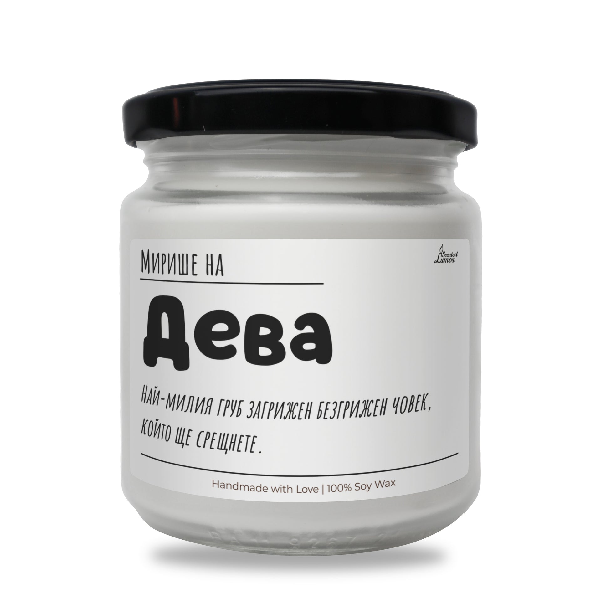 Оригинален подарък за Зодии с уникален дизайн: Мирише на Дева Ароматна Соева Свещ - Подарете с любов за 8-ми март, Рожден Ден, Имен Ден, годишнина или друг специален повод