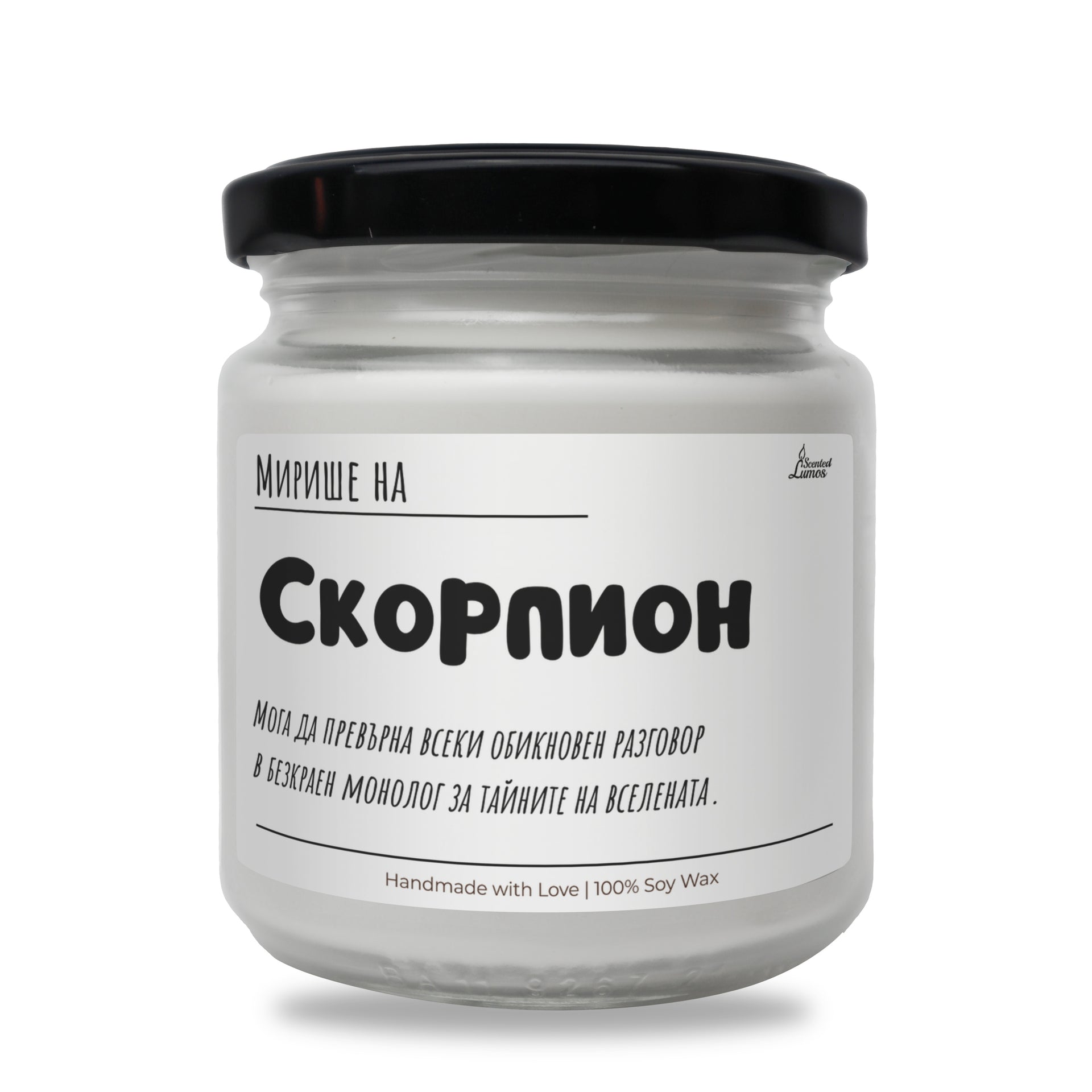 Оригинален подарък за Зодии с уникален дизайн: Мирише на Скорпион Ароматна Соева Свещ - Подарете с любов за 8-ми март, Рожден Ден, Имен Ден, годишнина или друг специален повод