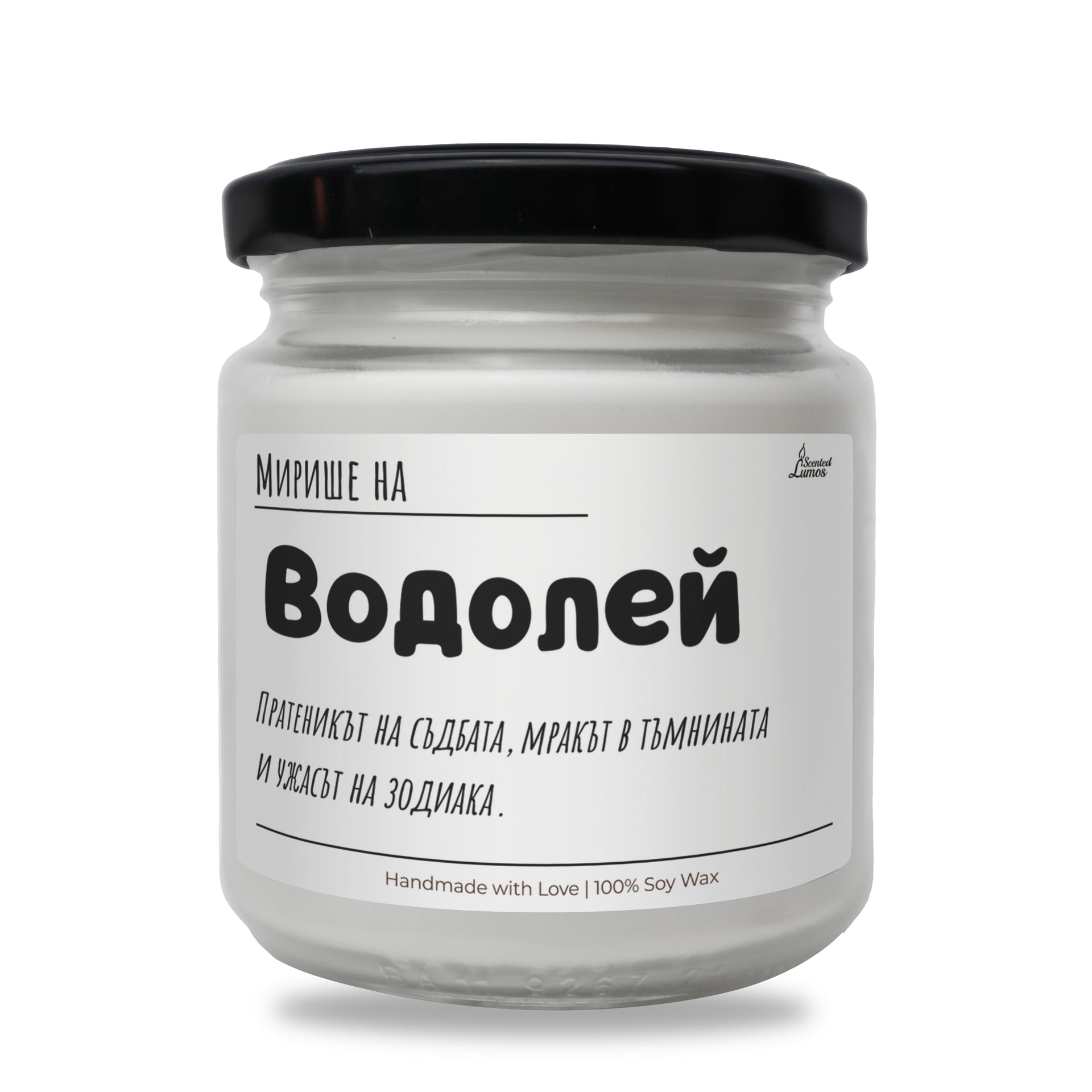 Оригинален подарък за Зодии с уникален дизайн: Мирише на Водолей Ароматна Соева Свещ - Подарете с любов за 8-ми март, Рожден Ден, Имен Ден, годишнина или друг специален повод