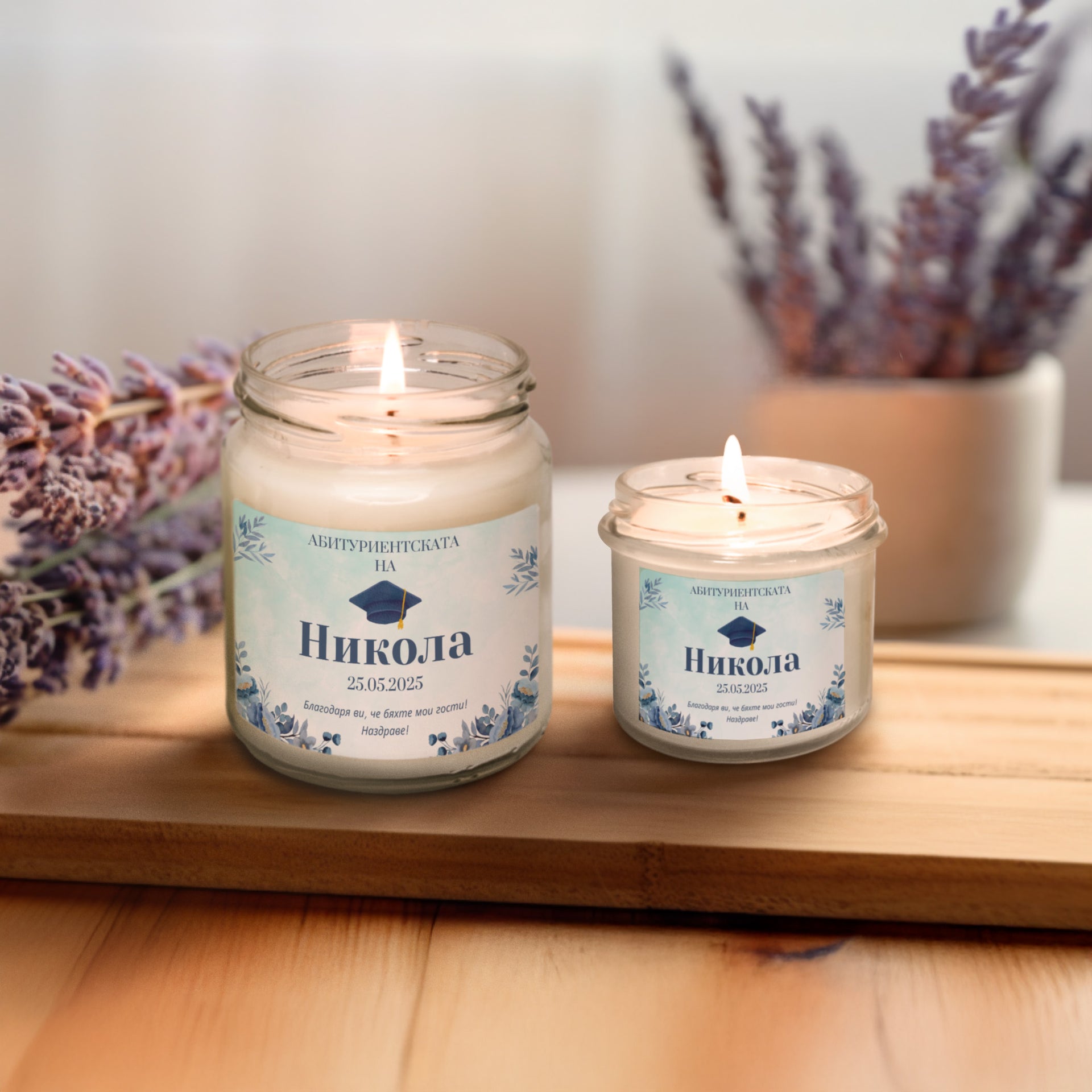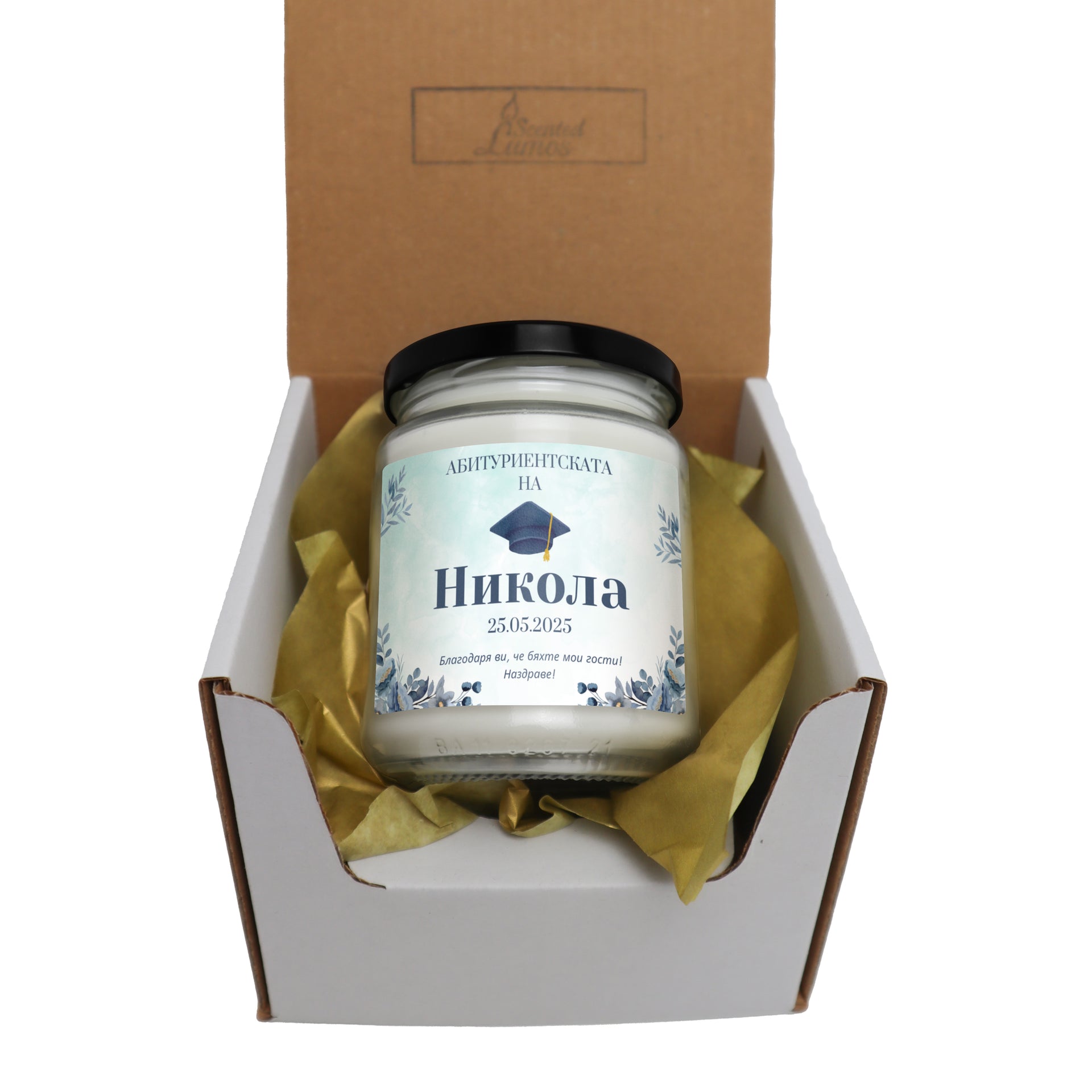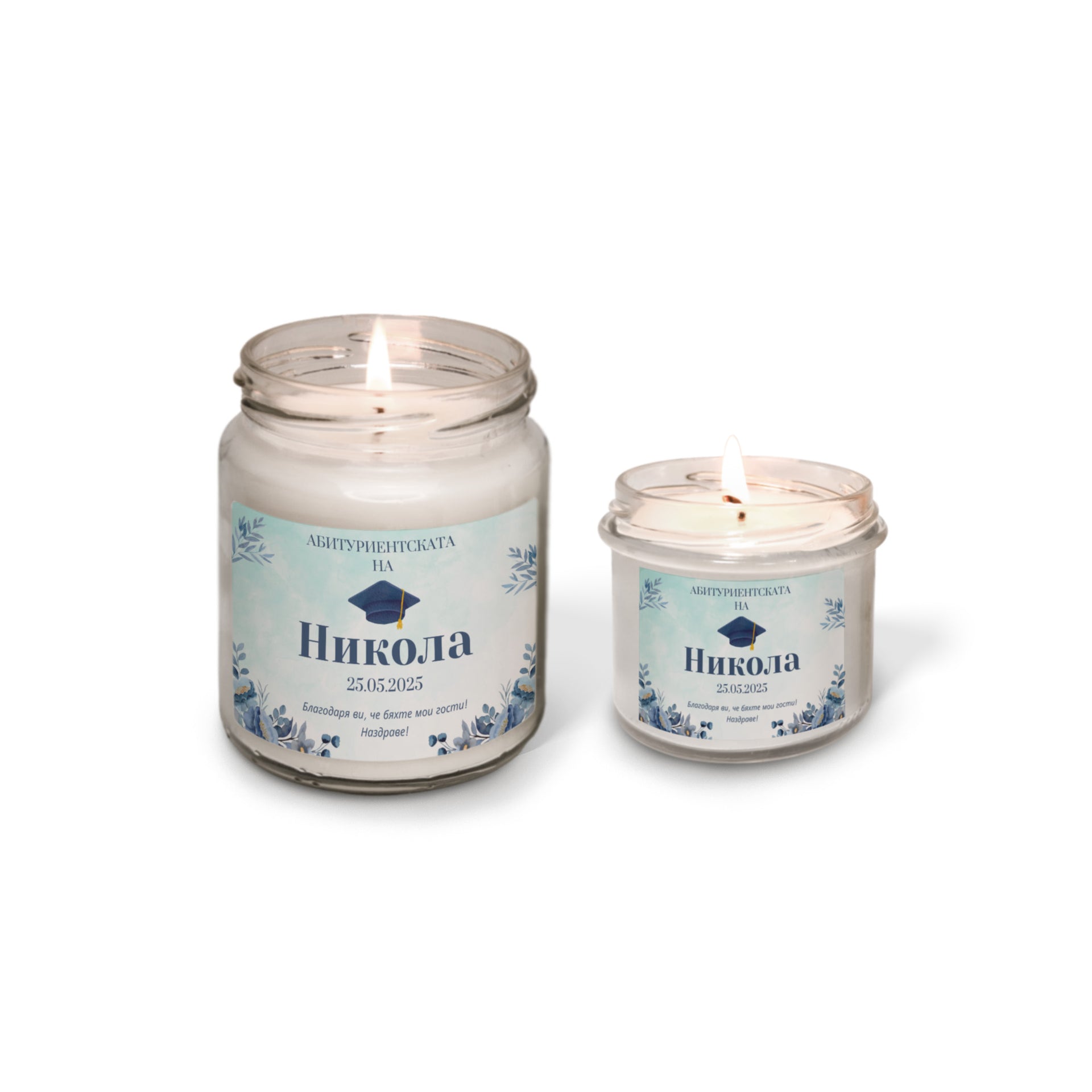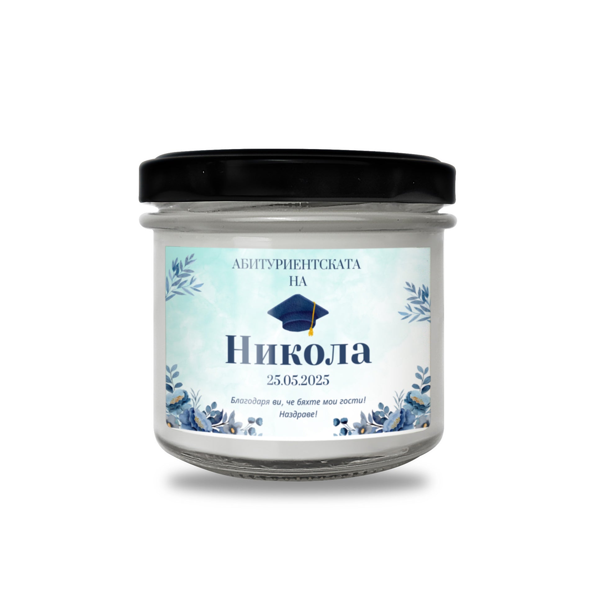 Абитуриенската на /име/, със синя шапка Персонализирана Ароматна Свещ
