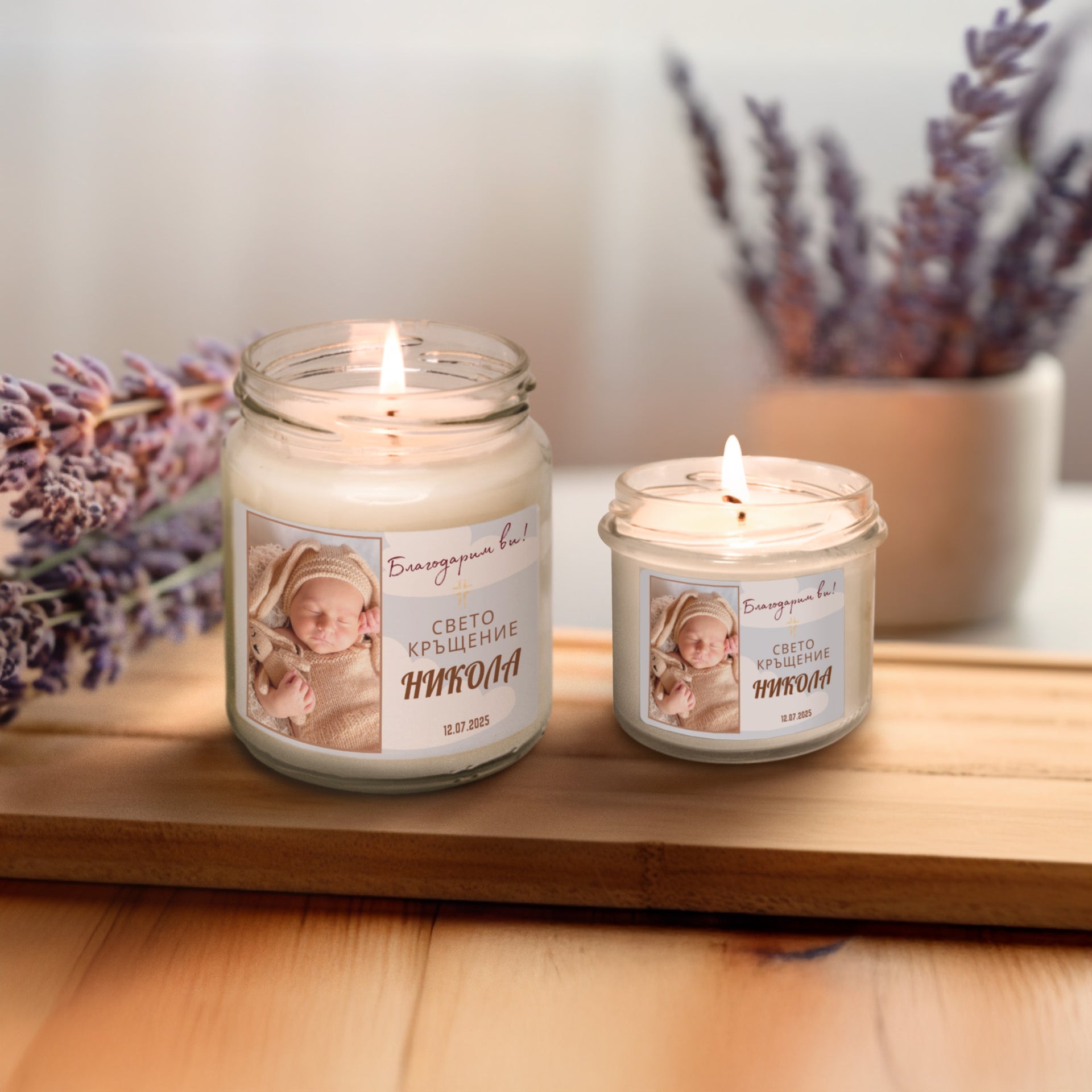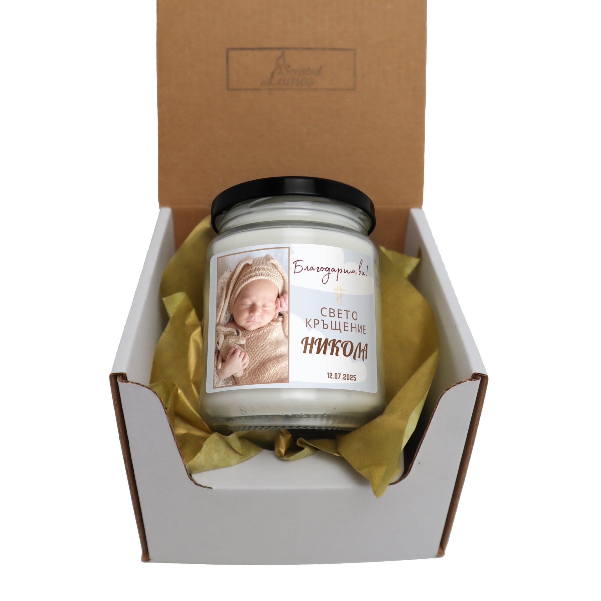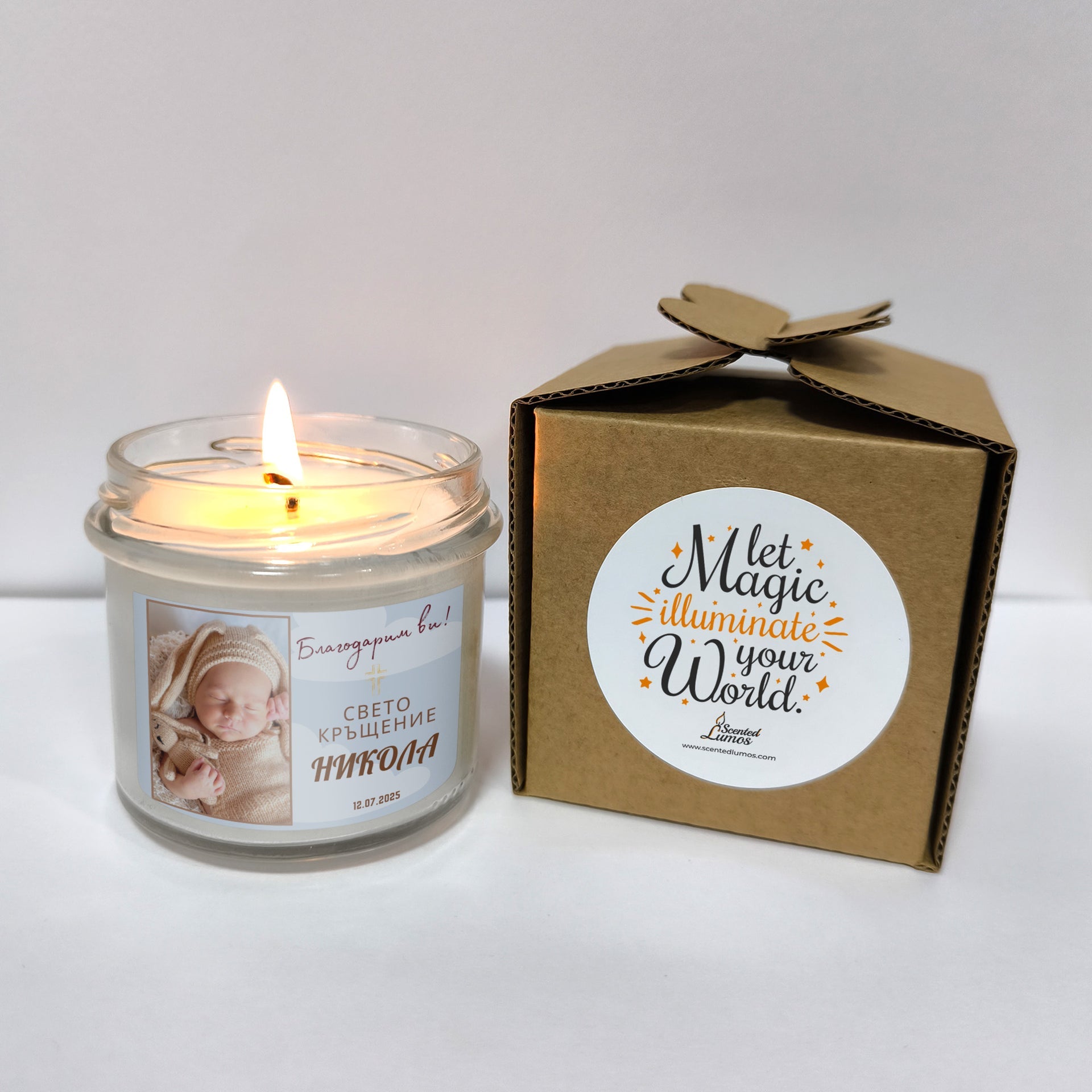 Подарък за кръщене Персонализирана Ароматна Соева Свещ със снимка