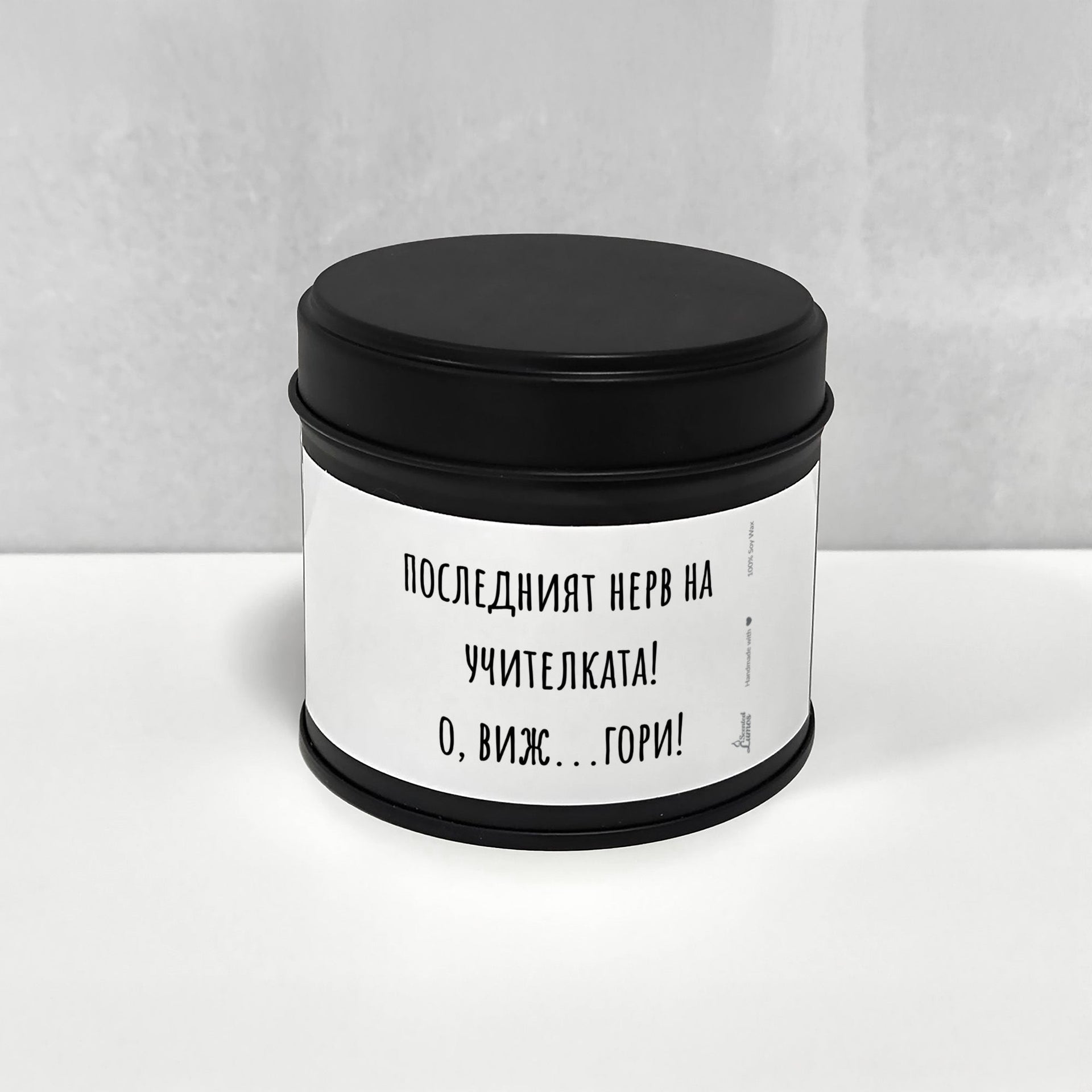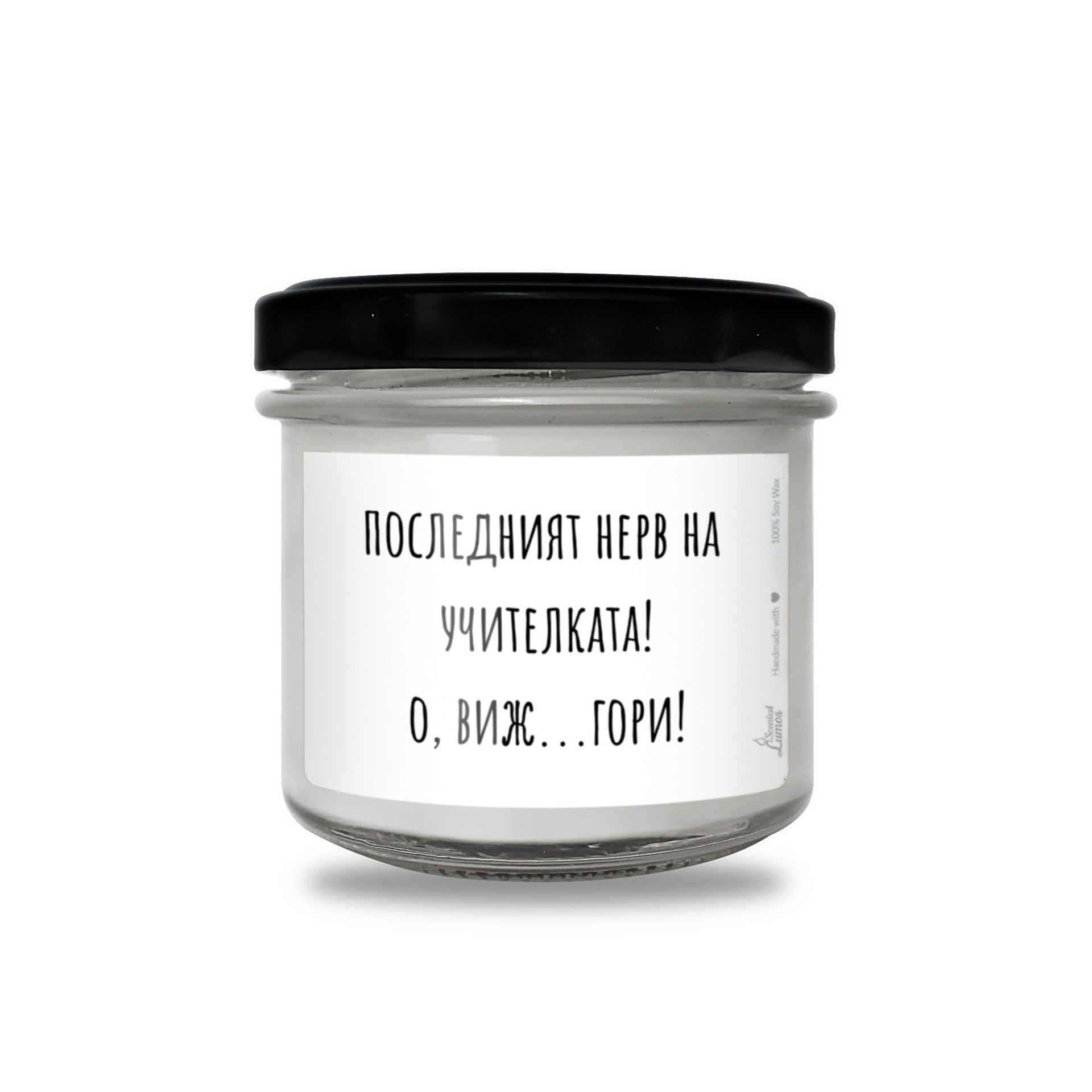Оригинален подарък за Учителка с уникален дизайн: Последният нерв на учителката! Ароматна Соева Свещ - Подарете с любов за 8-ми март, Рожден Ден, Имен Ден, годишнина или друг специален повод.