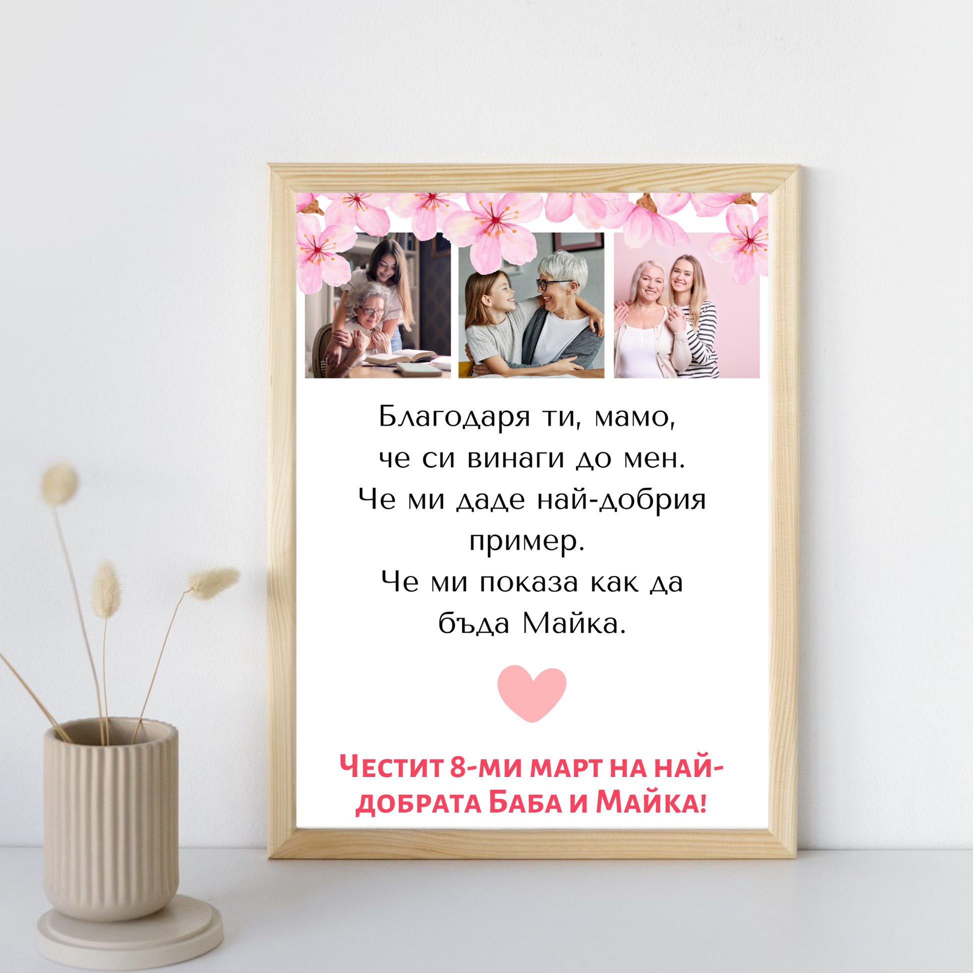 Този красив персонализиран Постер подарък за 8ми март с дизайн Честит 8-ми март на най-добрата Баба и Майка!, принтиран на висококачествена гланцирана фотохартия е перфектният подарък за любимите ви майки и баби. Изпратете ни пожелание и любимите си снимки, за да персонализираме Вашия постер.