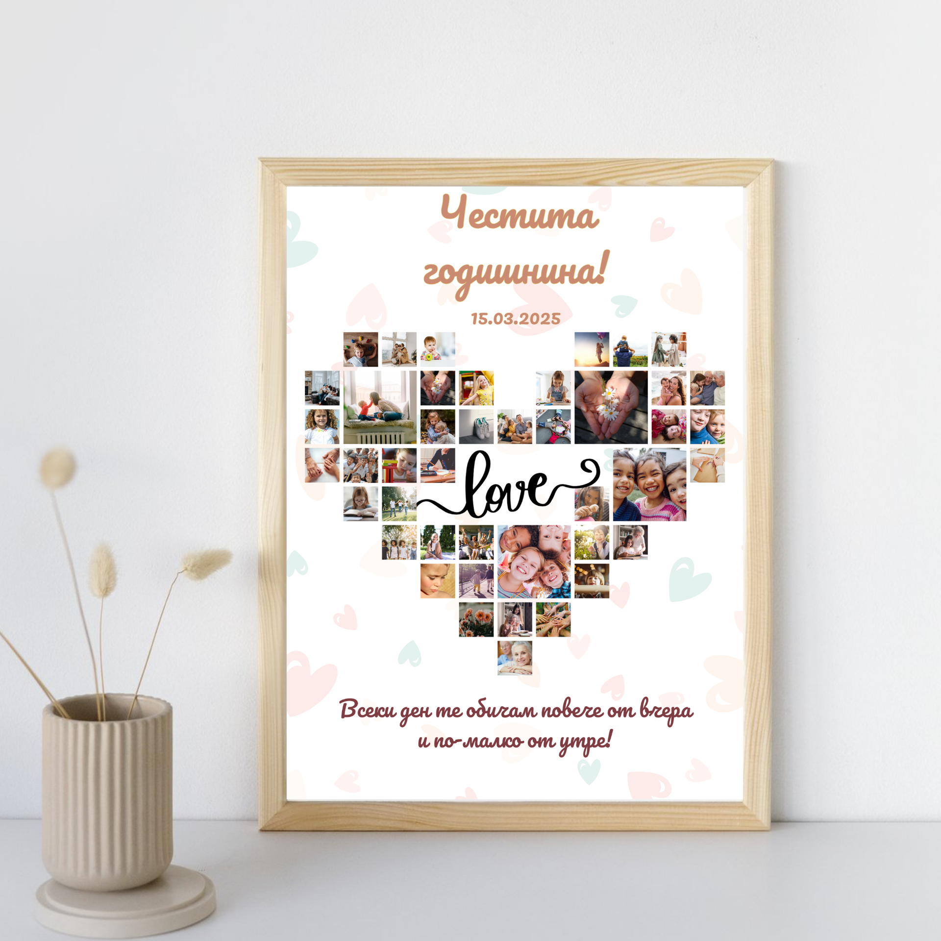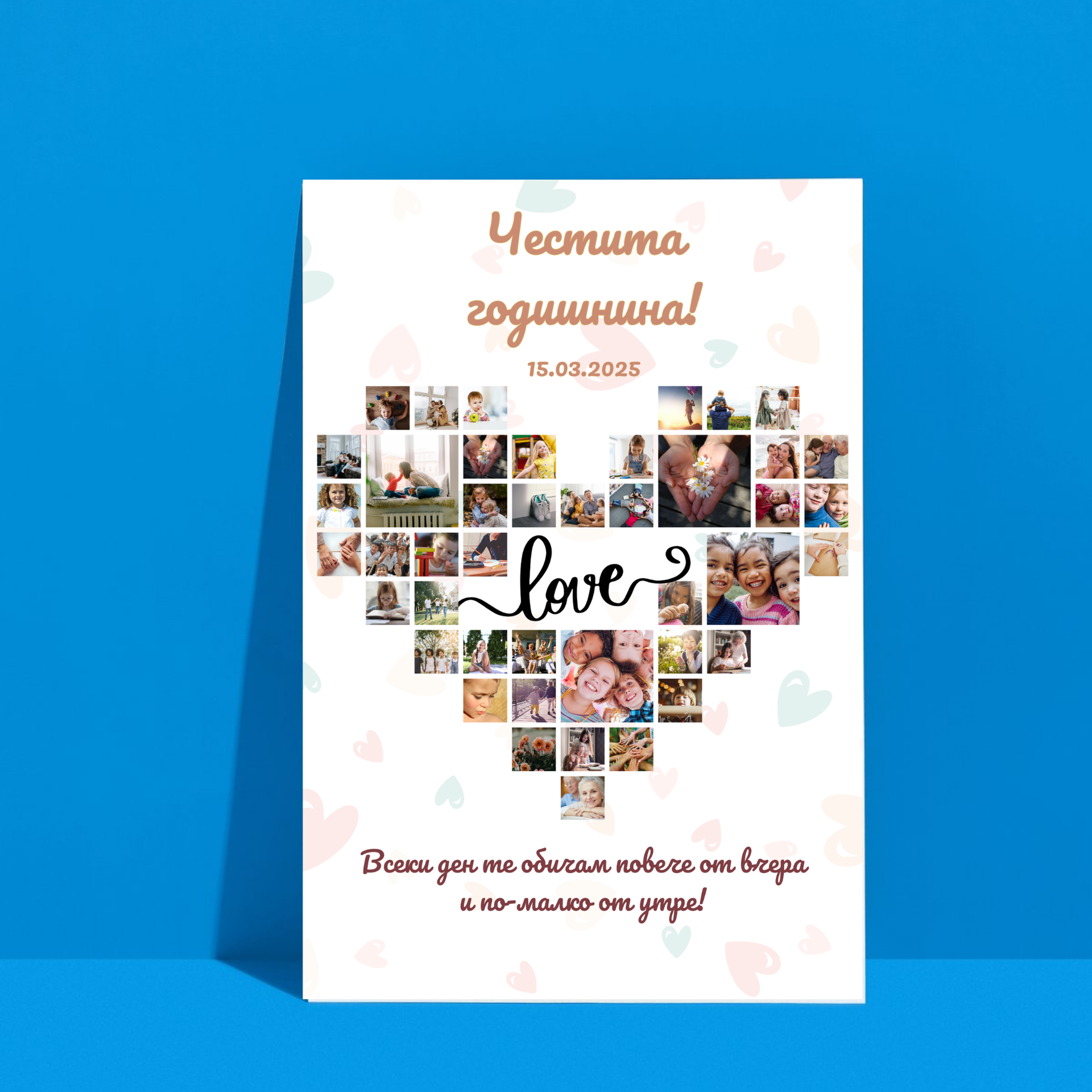 Този красив персонализиран със снимка и пожелание Постер за годишнина с дизайн Честита годишнина! Всеки ден те обичам повече от вчера и по-малко от утре!, принтиран на висококачествена гланцирана фотохартия е перфектният подарък за годишнина от сватбата. Изпратете ни пожелание и любимите си снимки, за да персонализираме Вашия постер.
