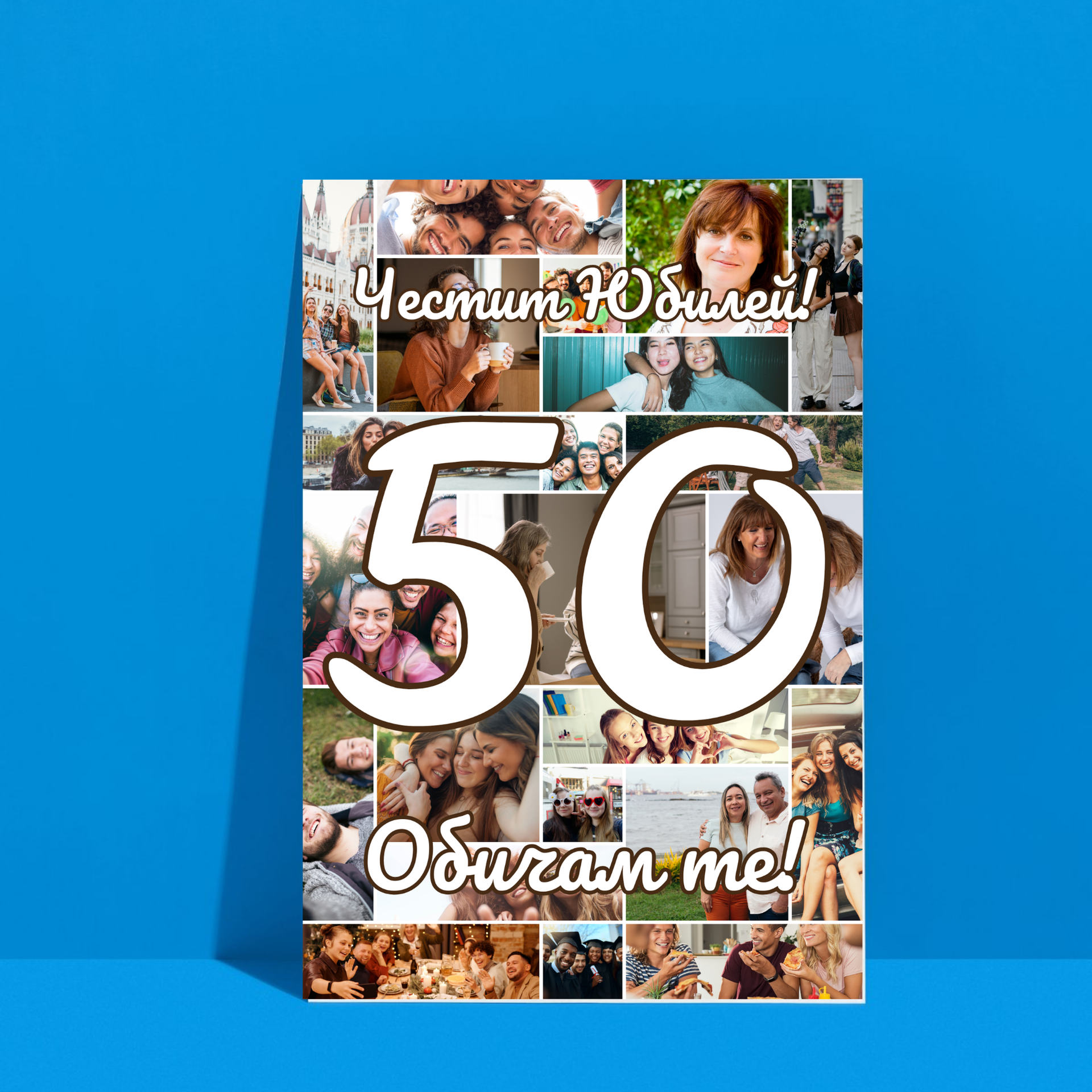 Този персонализиран с най-хубавите ви снимки постер за юбилей, рожден ден с дизайн Честит юбилей! Обичам те!, принтиран на висококачествена гланцирана фотохартия е перфектният подарък за рожден ден. Изпратете ни пожелание и любимите си снимки, за да персонализираме Вашия постер.