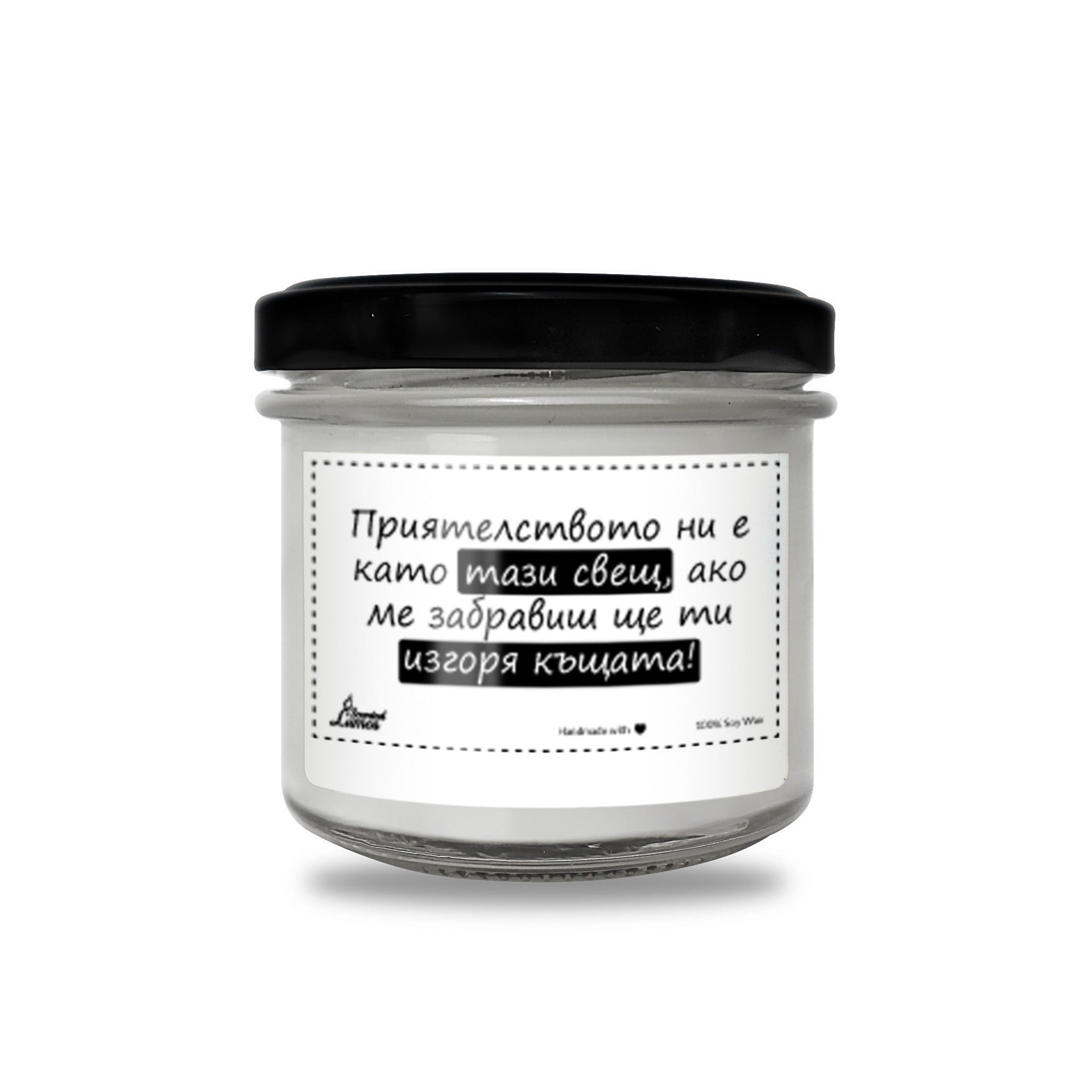 Уникален подарък за Приятели със стилен дизайн: Приятелството ни е като тази свещ, ако ме забравиш ще ти изгоря къщата Ароматна Соева Свещ - Подарете с любов за всеки повод, Коледа, Рожден Ден, Имен Ден, 8-ми март, годишнина или друг специален повод