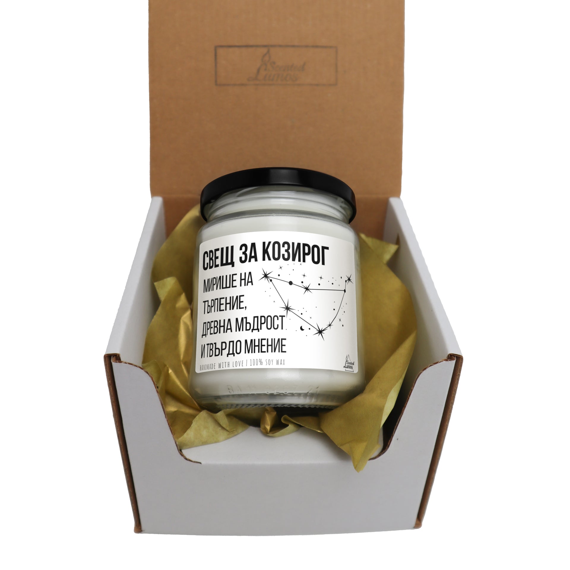 Оригинален подарък за зодия Козирог с уникален дизайн: Свещ за Козирог - Мирише на търпение, древна мъдрост и твърдо мнение. Подарете с любов за 8-ми март, Коледа, Рожден Ден, Имен Ден, годишнина или друг специален повод.