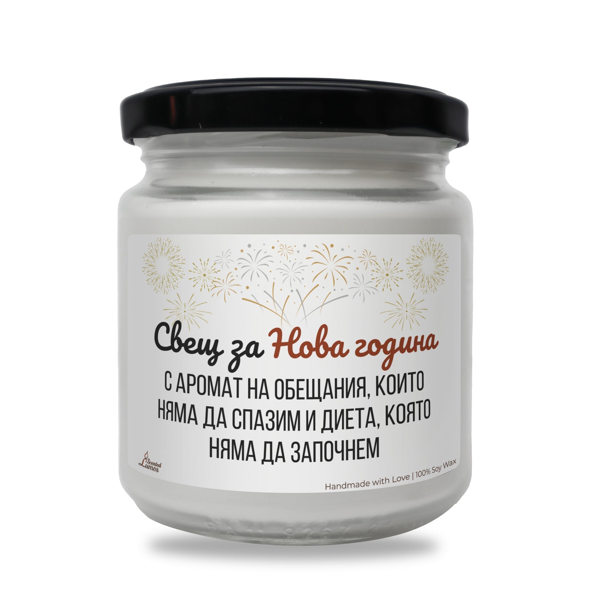 Оригинален подарък за Коледа с уникален дизайн: Свещ за Нова година - С аромат на обещания, които няма да спазим и диета, която няма да започнем. Подарете с любов за Коледа, Рожден Ден, Имен Ден, годишнина или друг специален повод.