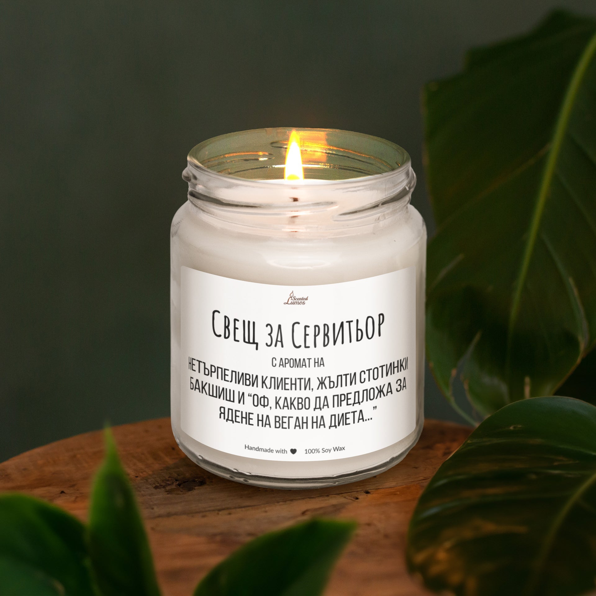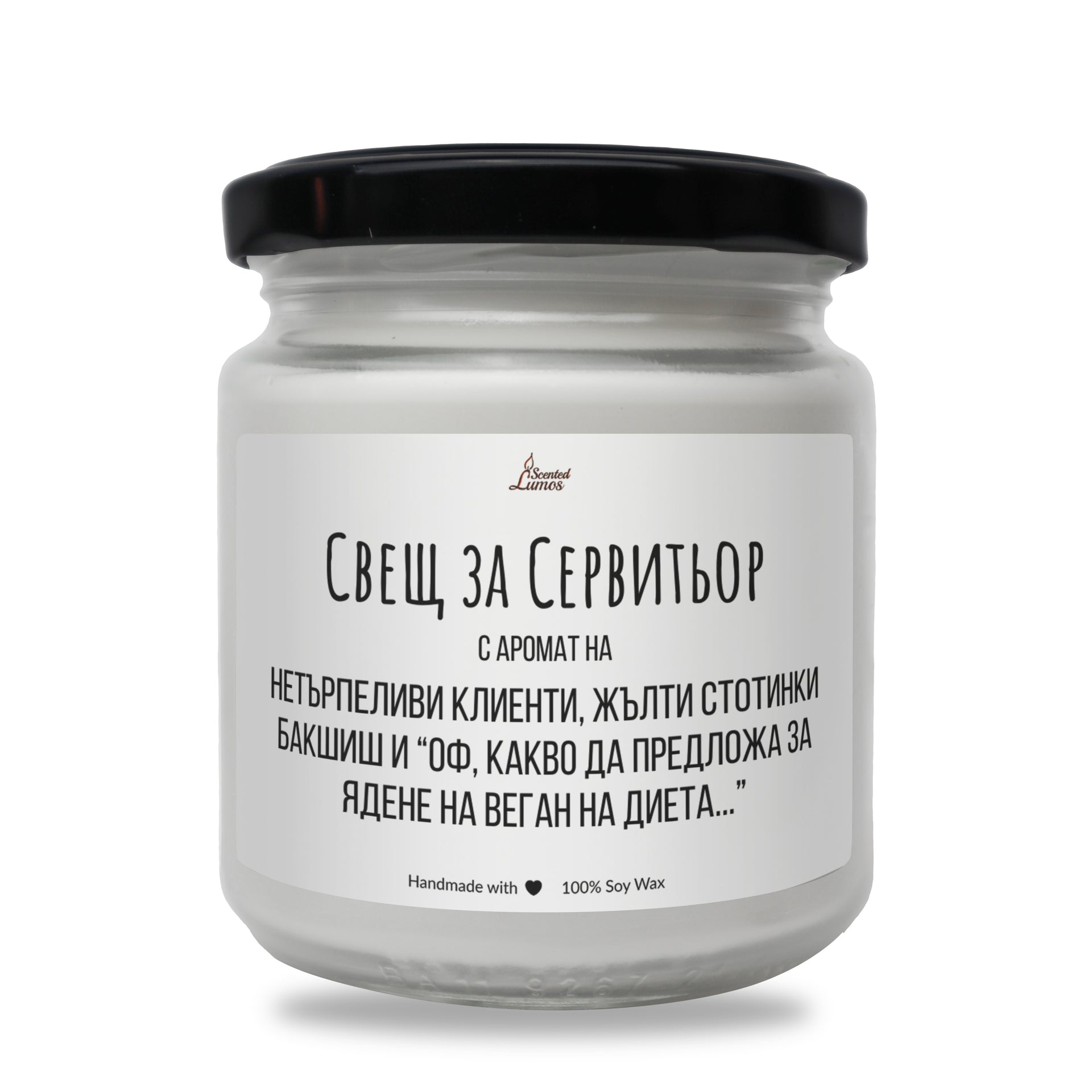 Оригинален подарък за Сервитьор с интересен дизайн: Свещ за сервитьор - с аромат на нетърпеливи клиенти, жълти стотинки бакшиш и "Оф, какво да предложа за ядене на веган на диета...".