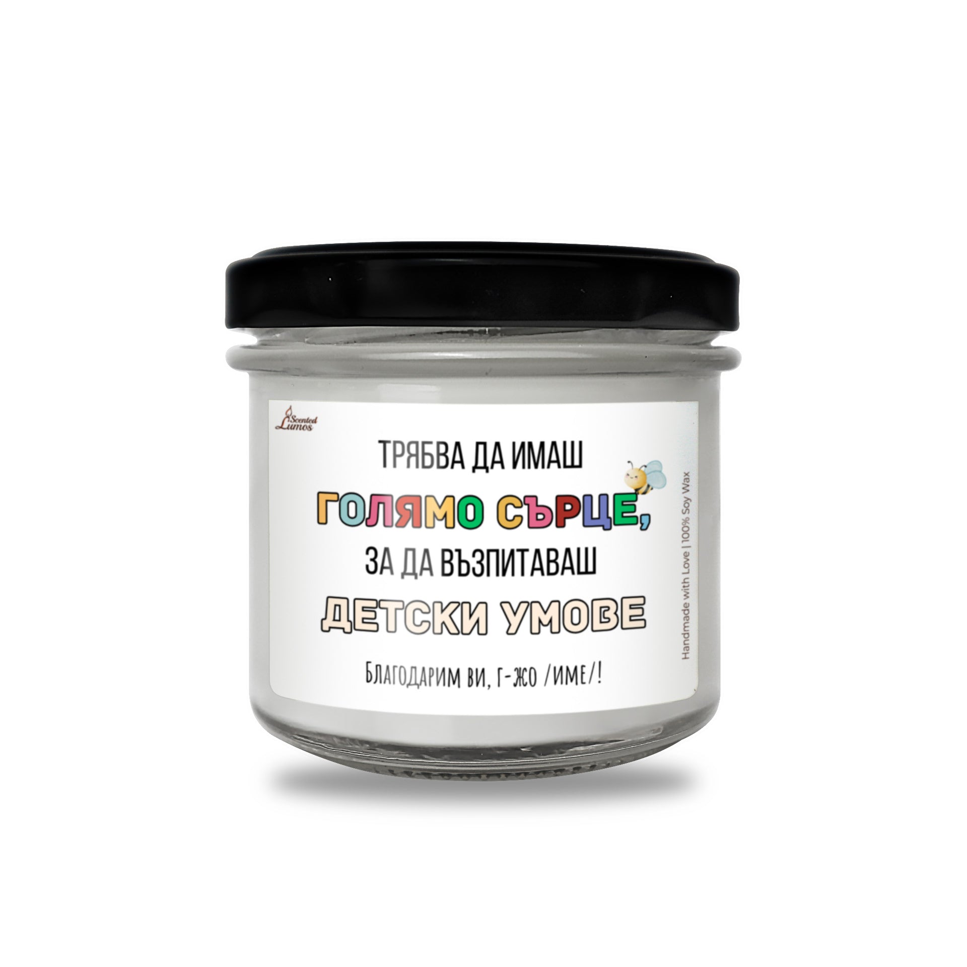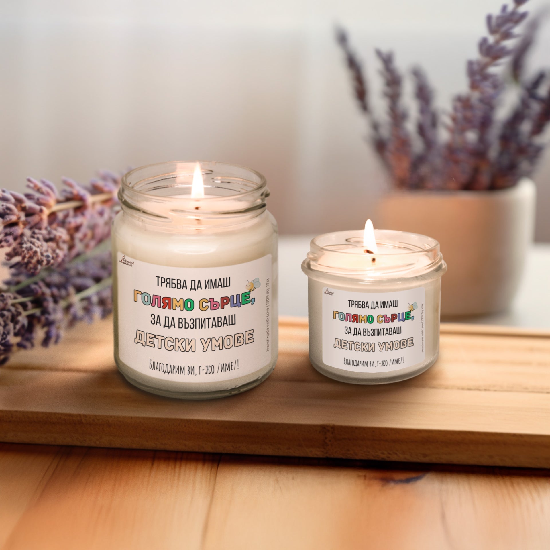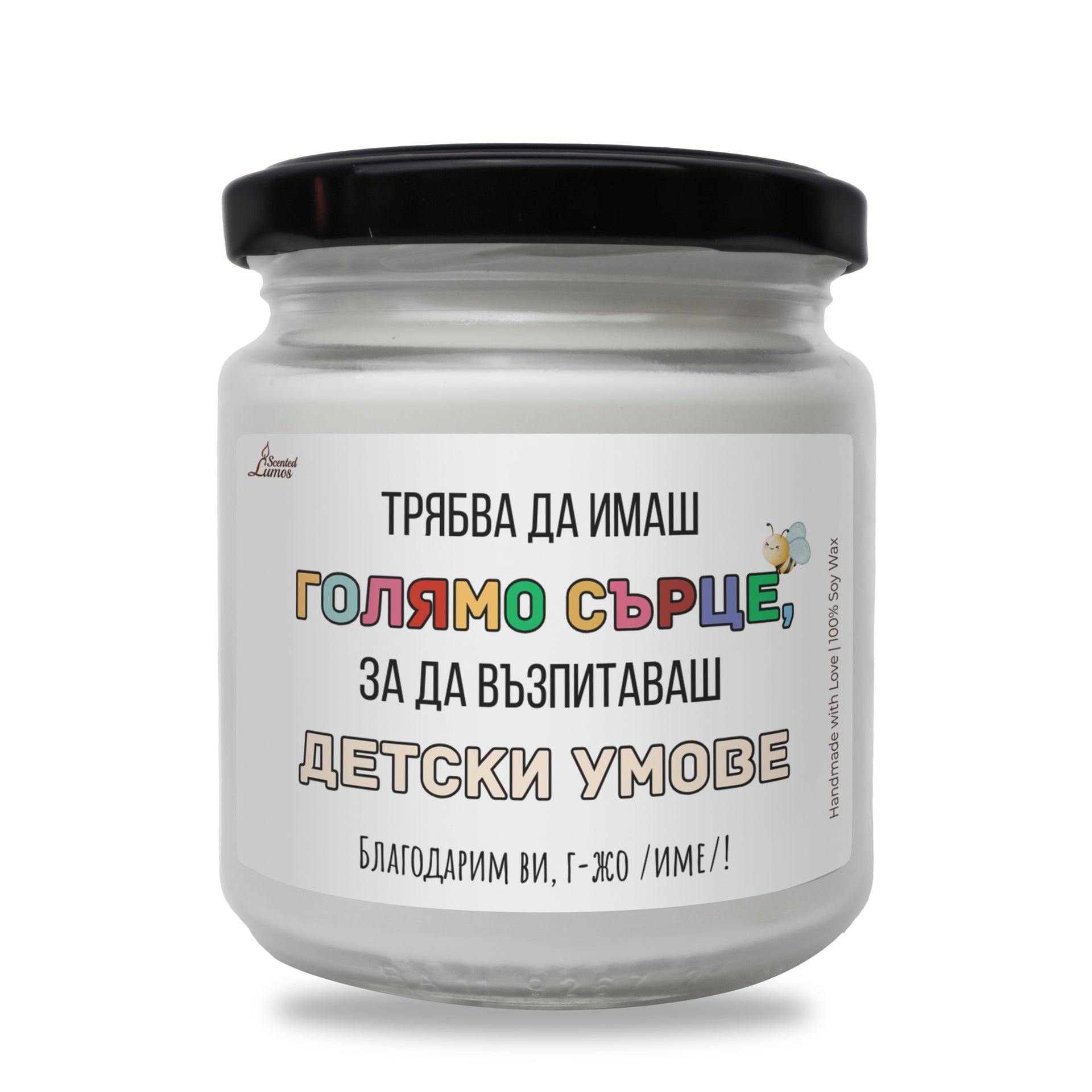Трябва да имаш голямо сърце, за да възпитаваш детски умове Ароматна соева свещ за учител