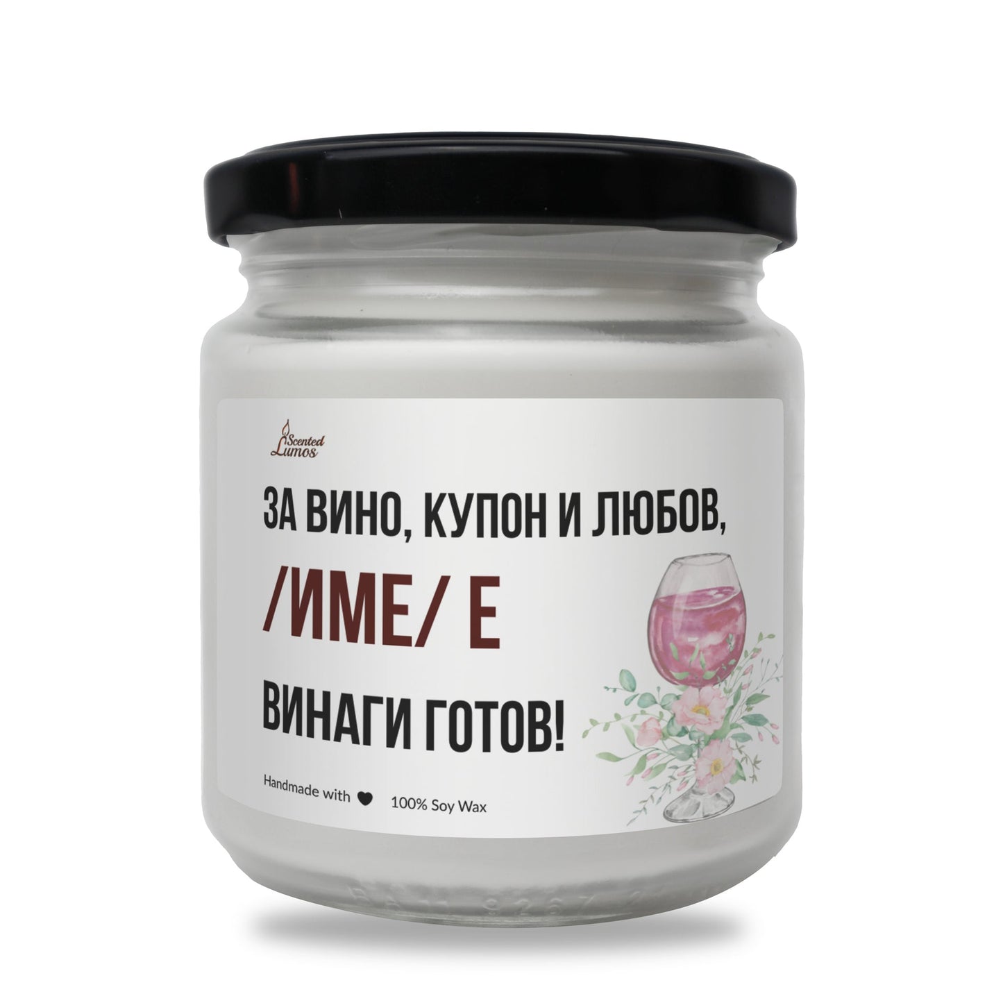 Оригинален персонализиран подарък с уникален дизайн: /ИМЕ/ винаги готов за... Ароматна Соева Свещ - Подарете с любов за Цветница, Рожден Ден, Имен Ден, годишнина или друг специален повод.