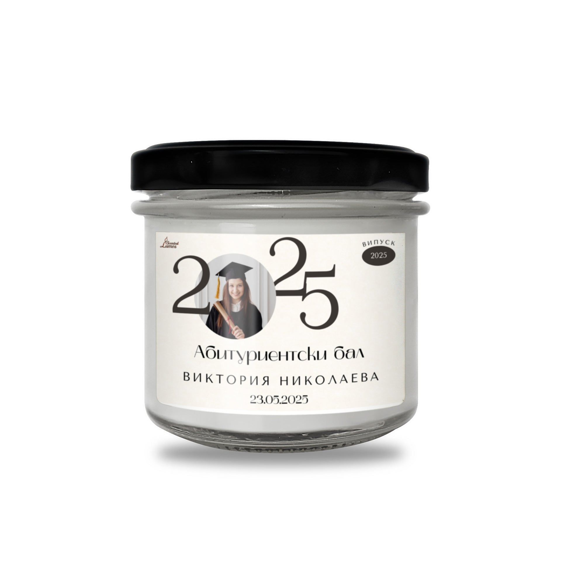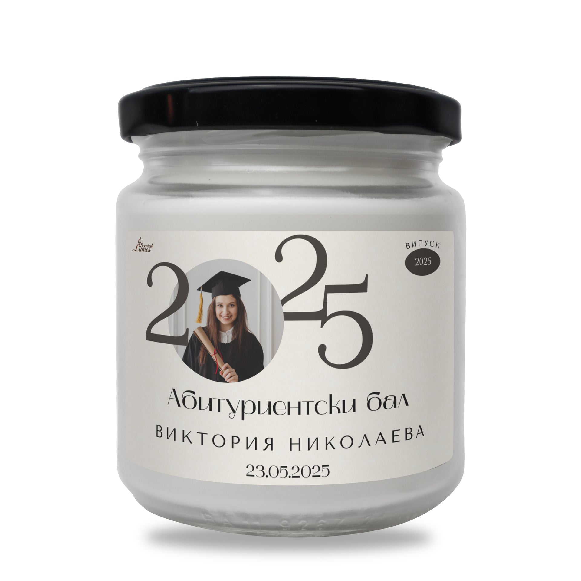 Оригинални подаръци за гости на абитуриентски бал с персонализиран дизайн: Випуск 2025, Абитуриентски бал на /име/ с добавена дата. Изцяло персонализирана свещ за гостите на вашия бал.