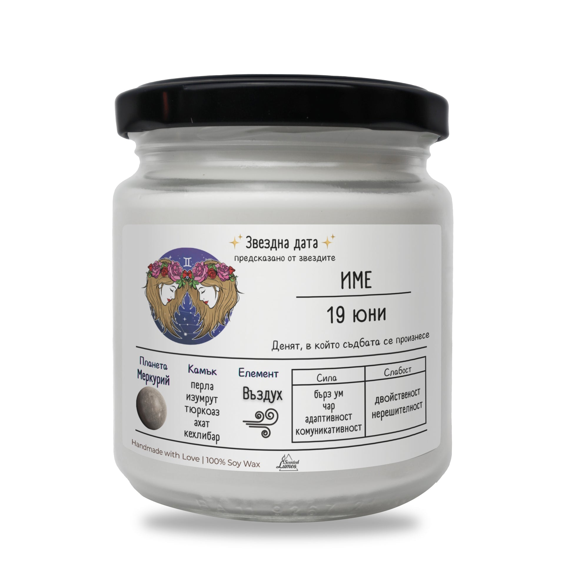 Оригинален подарък за Зодия Близнаци с уникален и персонализиран дизайн: Звездна дата Близнаци Ароматна Соева Свещ - Подарете с любов за 8-ми март, Рожден Ден, Имен Ден, годишнина или друг специален повод