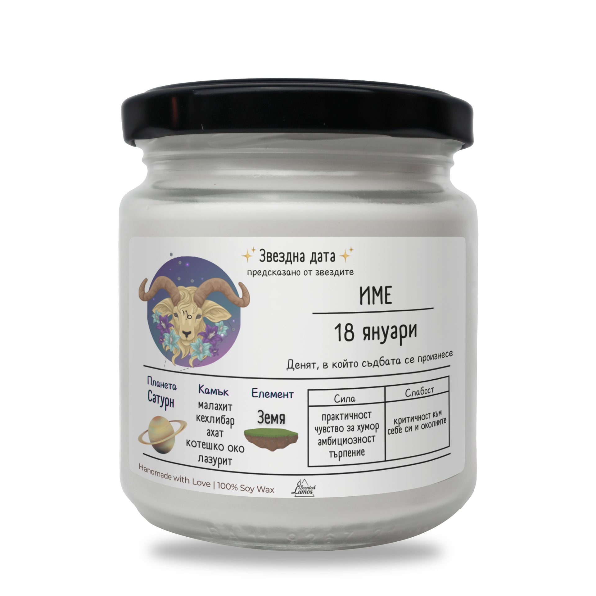 Оригинален подарък за Зодия Козирог с уникален и персонализиран дизайн: Звездна дата Козирог Ароматна Соева Свещ - Подарете с любов за 8-ми март, Рожден Ден, Имен Ден, годишнина или друг специален повод