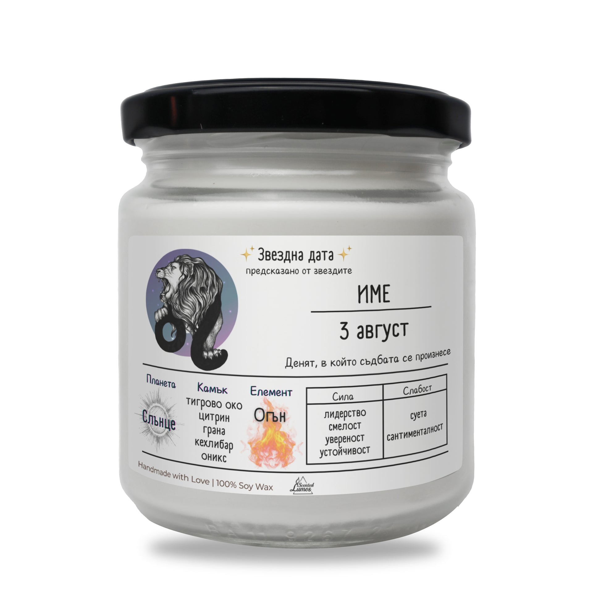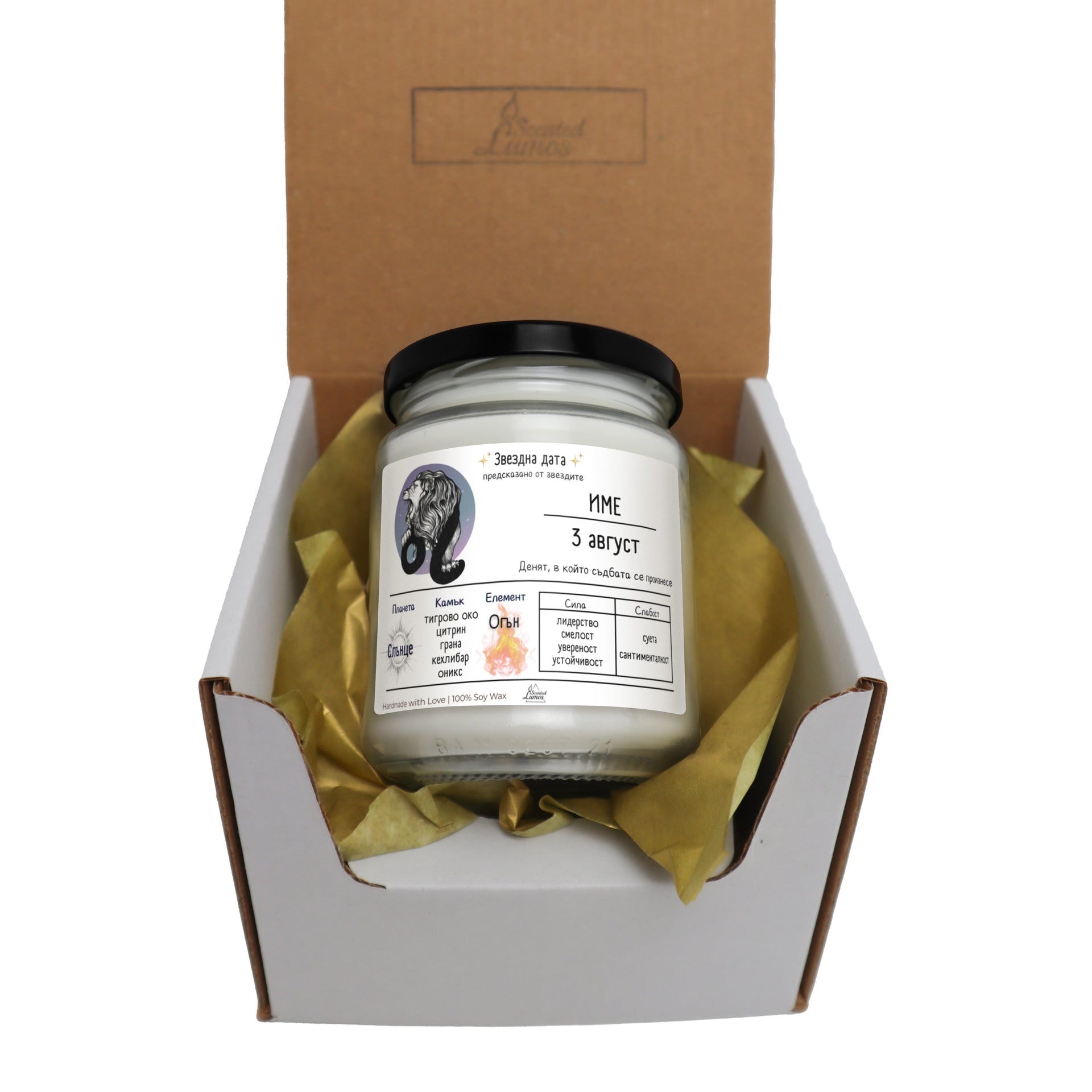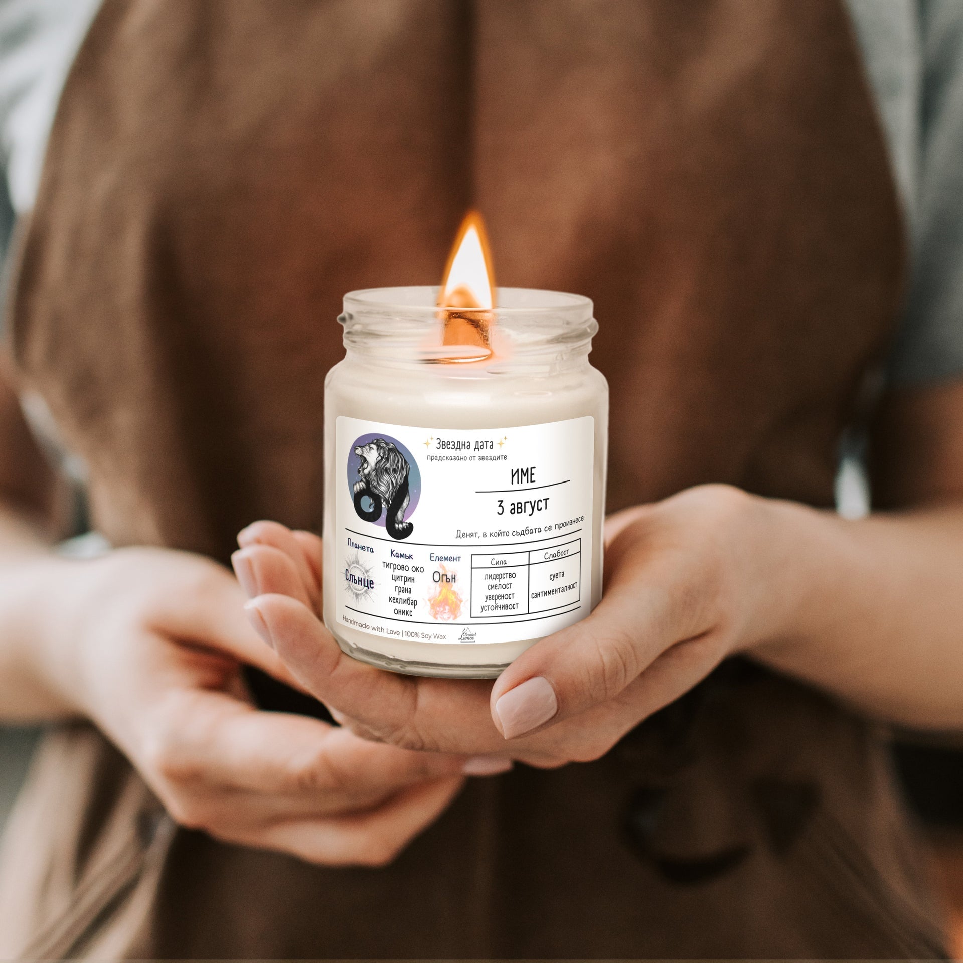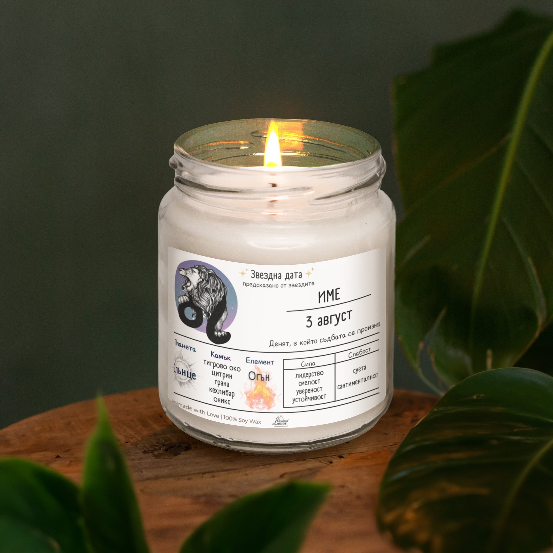 Оригинален подарък за Зодия Лъв с уникален и персонализиран дизайн: Звездна дата Лъв Ароматна Соева Свещ - Подарете с любов за 8-ми март, Рожден Ден, Имен Ден, годишнина или друг специален повод