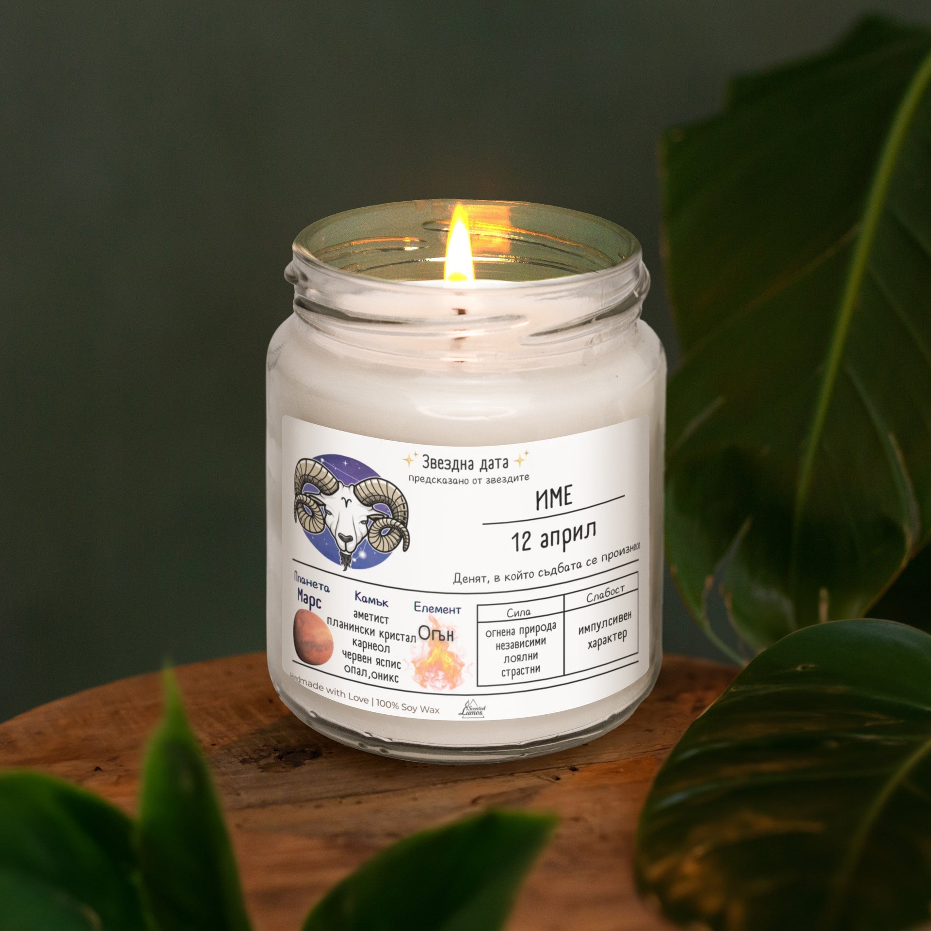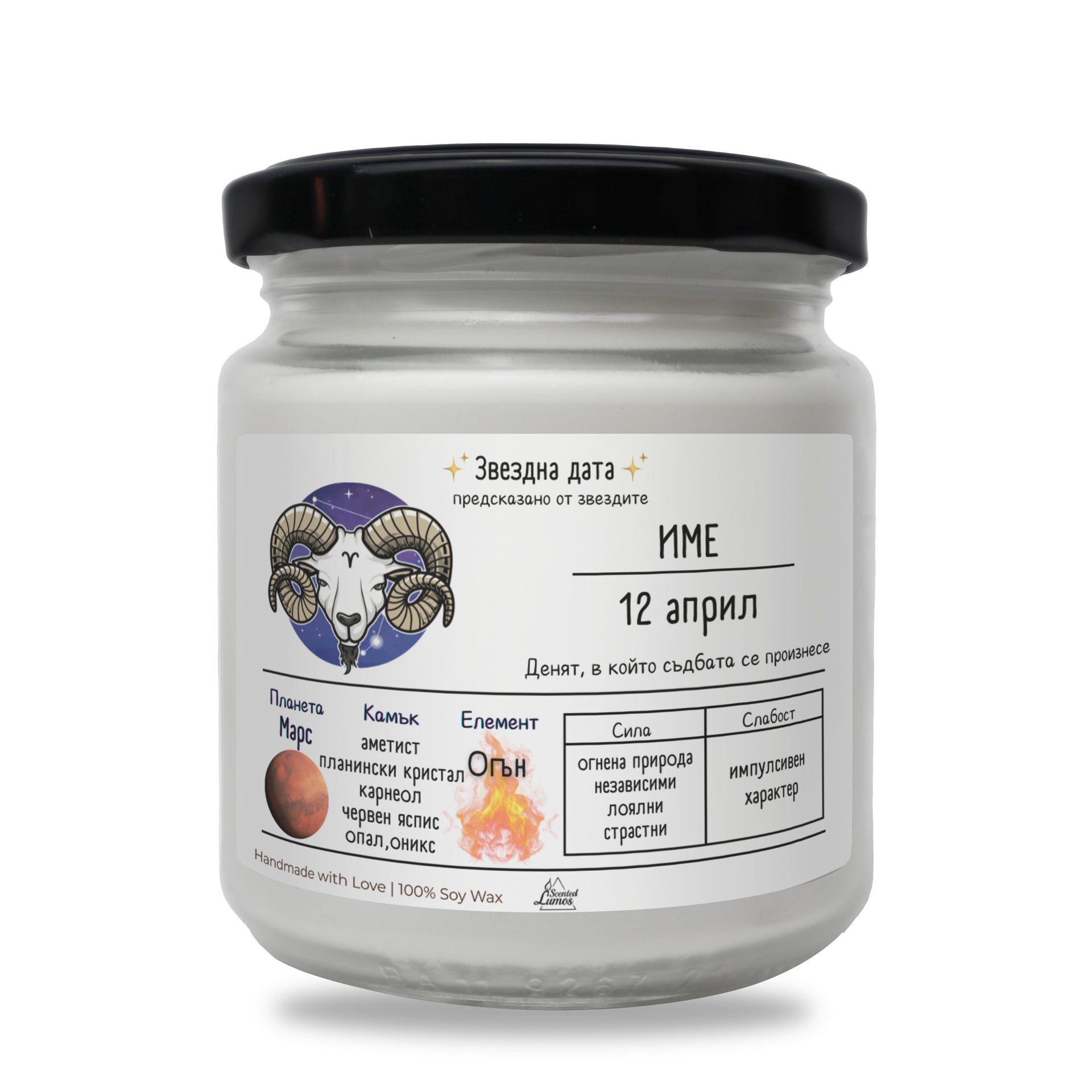 Оригинален подарък за Зодия Овен с уникален и персонализиран дизайн: Звездна дата Овен Ароматна Соева Свещ - Подарете с любов за 8-ми март, Рожден Ден, Имен Ден, годишнина или друг специален повод