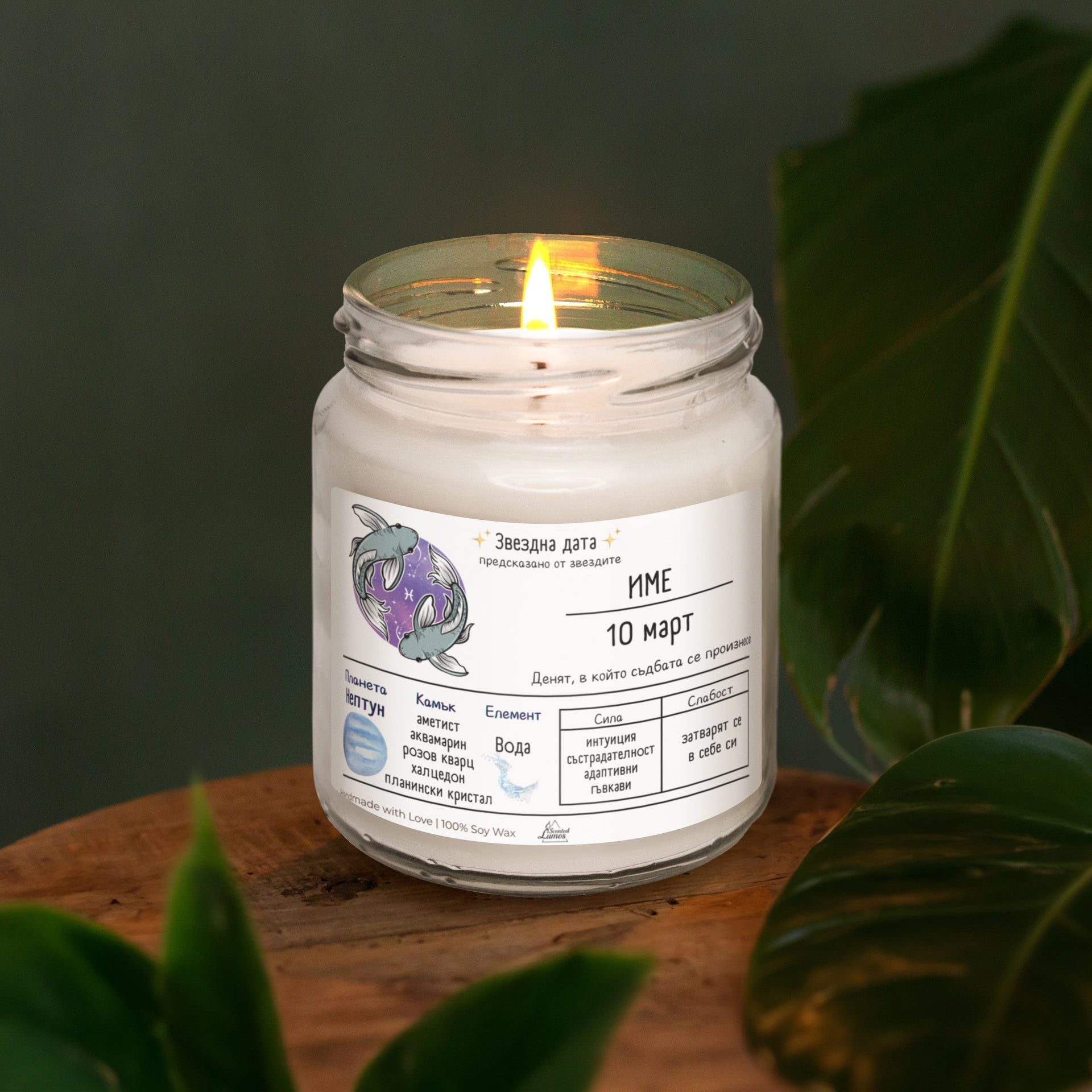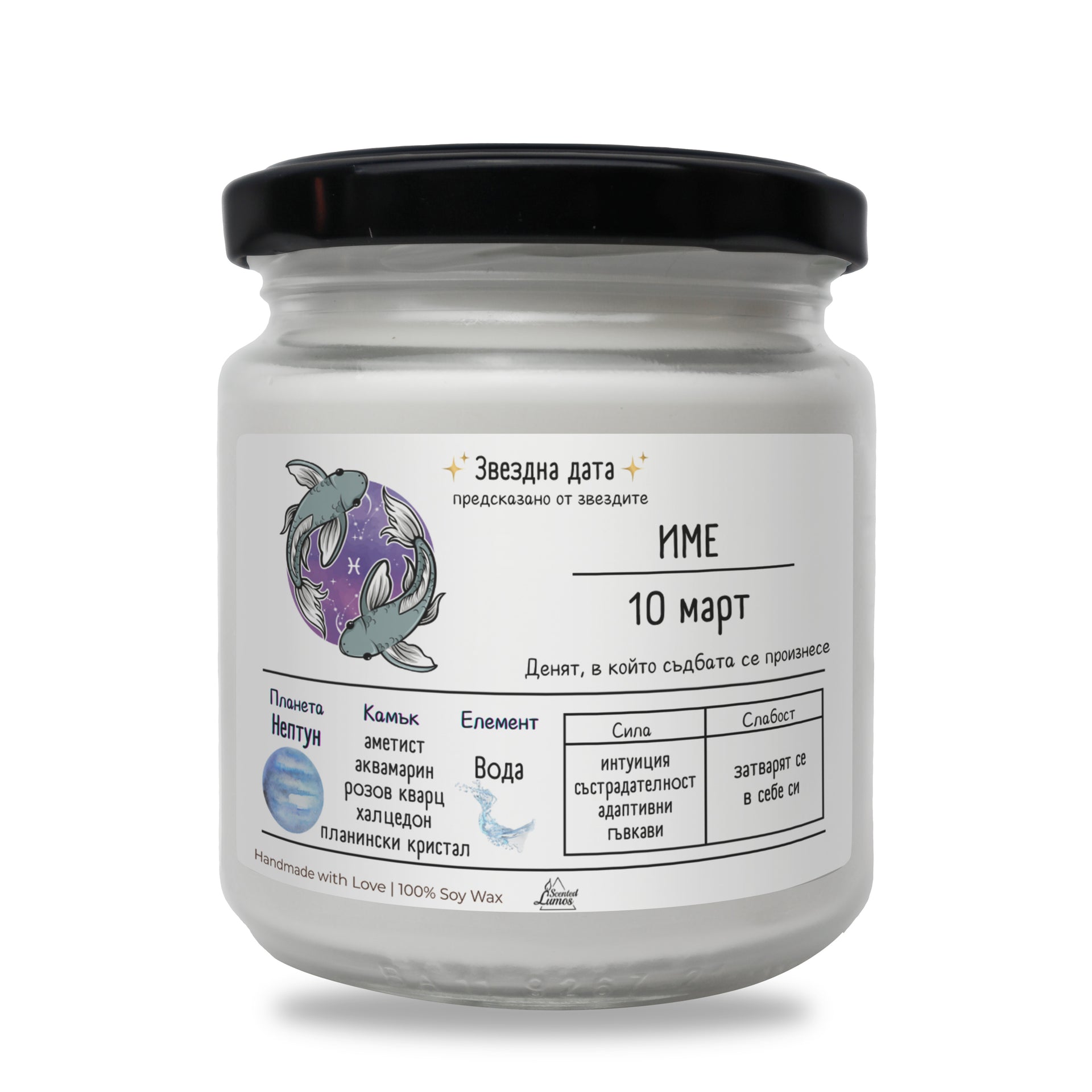 Оригинален подарък за зодия Риби с уникален и напълно персонализиран дизайн: Звездна дата Риби Ароматна Соева Свещ - Подарете с любов за 8-ми март, Рожден Ден, Имен Ден, годишнина или друг специален повод