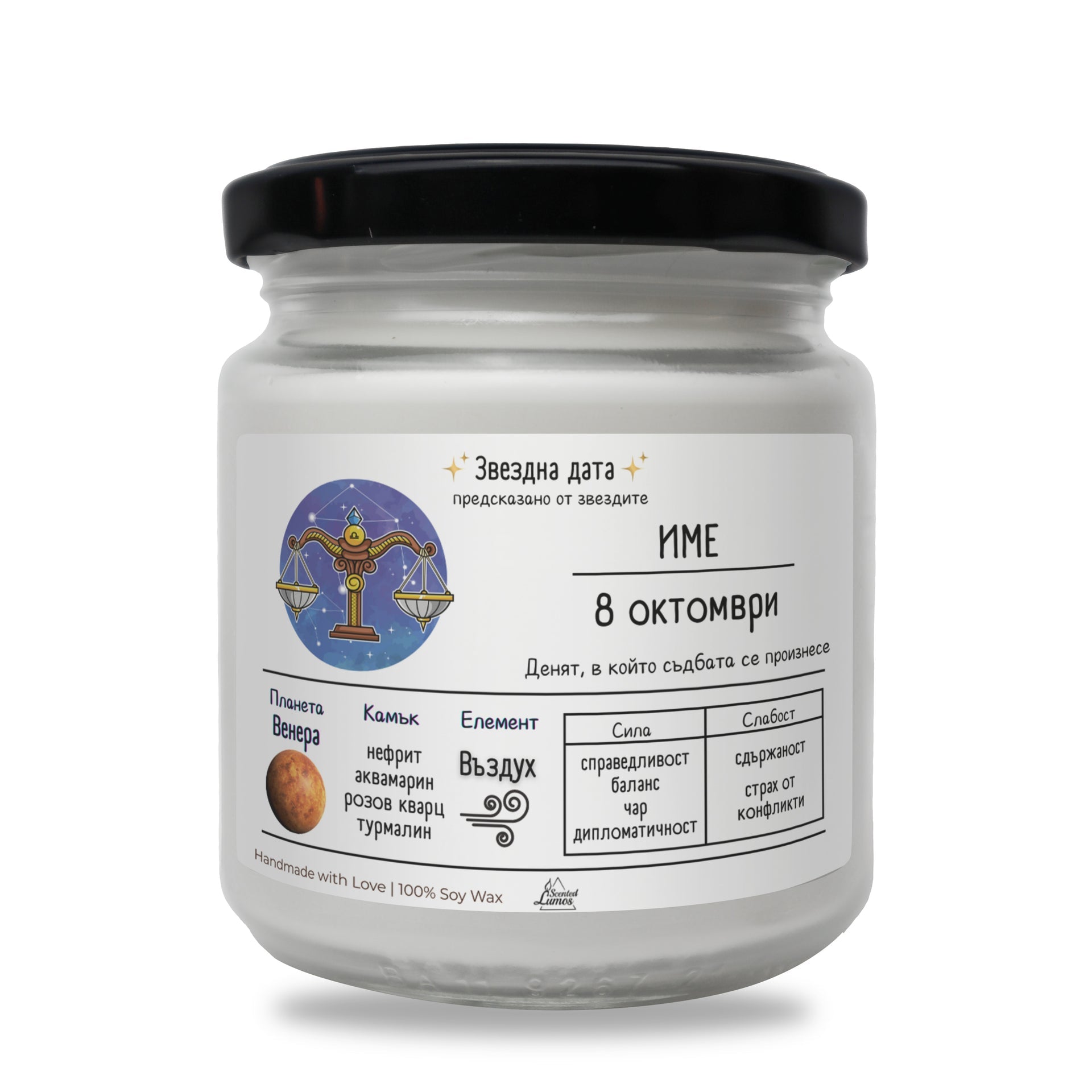 Оригинален подарък за Зодия Везни с уникален и персонализиран дизайн: Звездна дата Везни Ароматна Соева Свещ - Подарете с любов за 8-ми март, Рожден Ден, Имен Ден, годишнина или друг специален повод