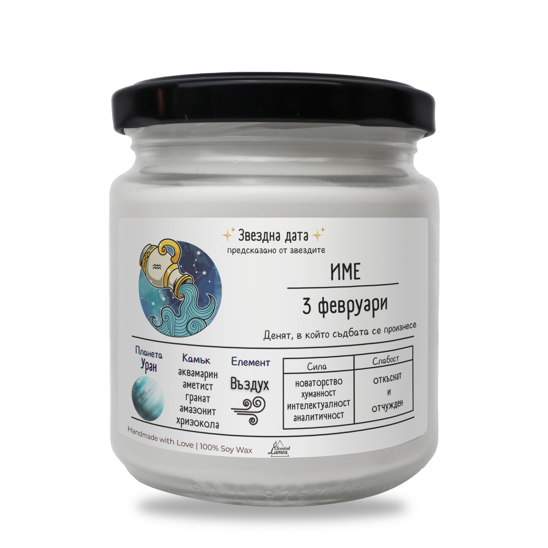 Оригинален подарък за Зодия Водолей с уникален и персонализиран дизайн: Звездна дата Водолей Ароматна Соева Свещ - Подарете с любов за 8-ми март, Рожден Ден, Имен Ден, годишнина или друг специален повод